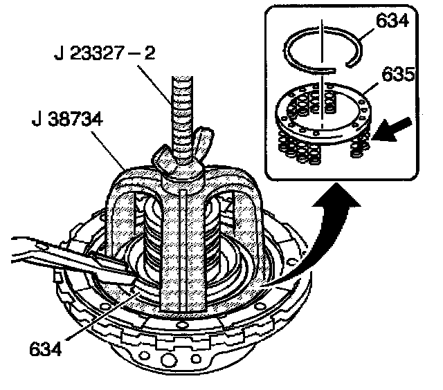 3. Compress the intermediate clutch spring assembly (635) using the J 23327 and the J 38734.