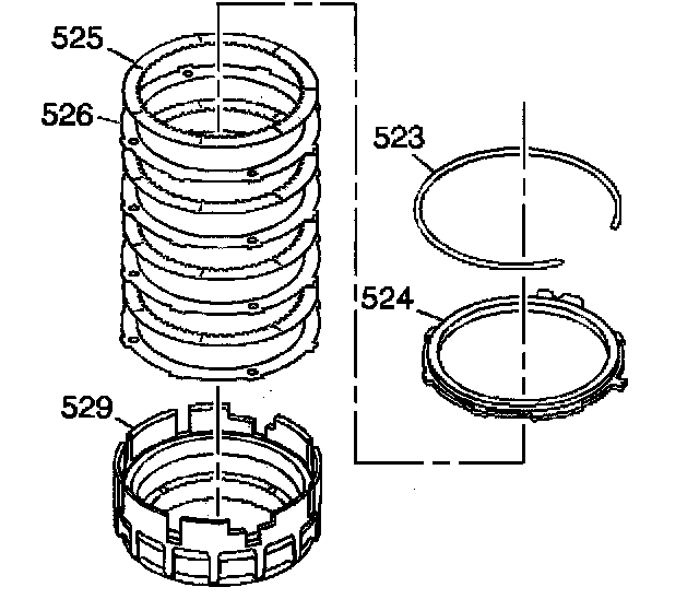 Important: Removal of the fourth clutch backing plate retainer ring, the fourth clutch backing plate, and the fourth clutch plates will ease assembly of the overrun clutch housing assembly.1. Remove the fourth clutch backing plate retainer ring (523).