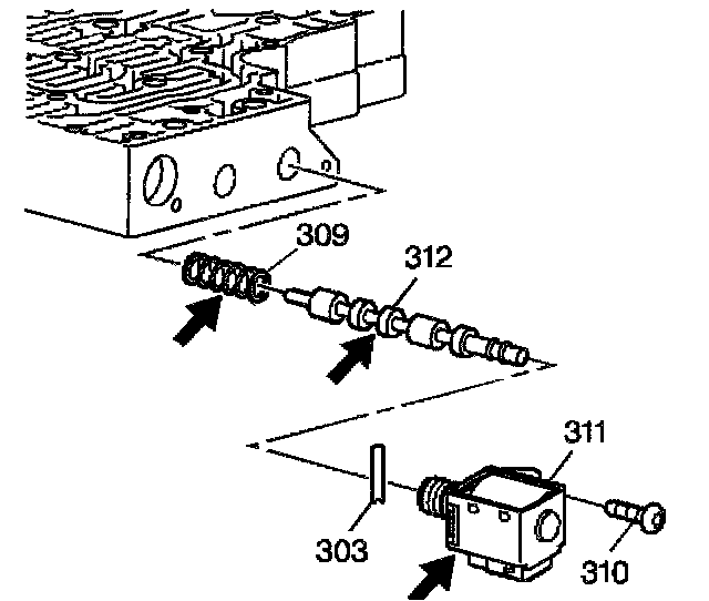 Caution: Valve springs can be tightly compressed. Use care when removing retainers and plugs. Personal injury could result.1. Remove the pressure control solenoid clamp bolt (310) and clamp (321).