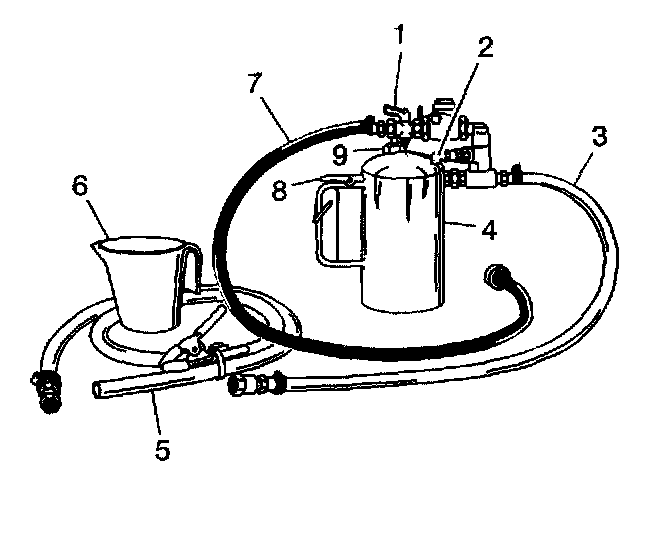 2. Remove the fill cap (9) on the J 35944-A and fill the flusher tank (4) with 0.6 L (20-21 oz) of J 35944-22, using the measuring cup (6). Do not overfill.