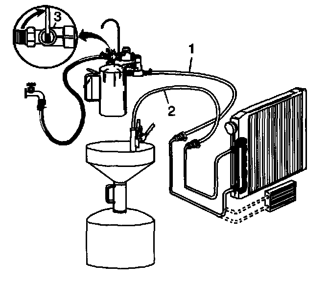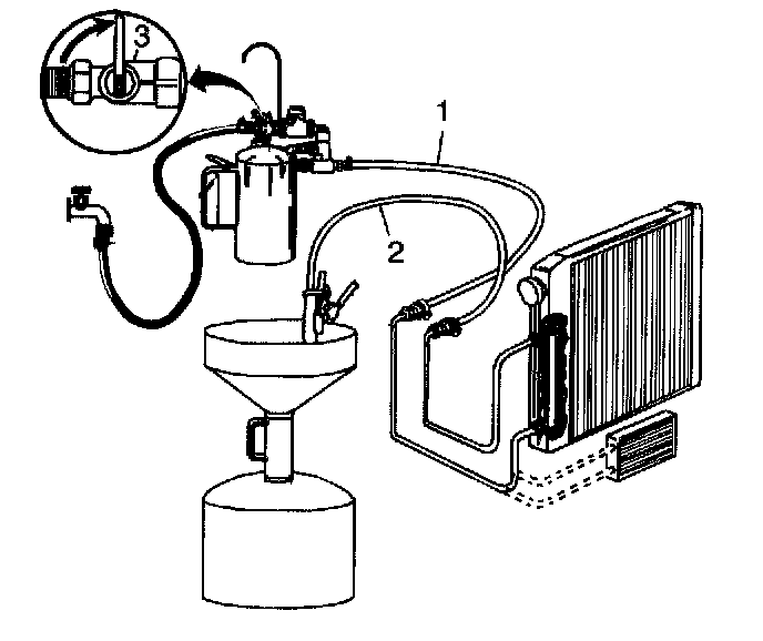 5. Turn the J 35944-A water supply valve (3) to the ON position and allow water to flow through the oil cooler and pipes for 10 seconds to remove any remaining transmission fluid. If water does not flow through the oil cooler and pipes, the cause of the blockage must be diagnosed and the plugged component must be repaired or replaced. Continue with the cooler flushing and flow check procedure once the blockage is corrected.