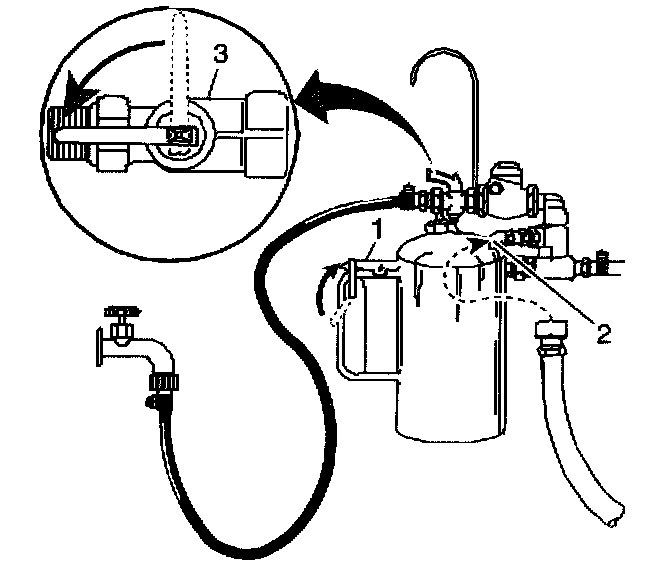 6. Turn the J 35944-A water supply valve (3) to the OFF position and clip the discharge hose onto a 19 liter (5 gallon) pail with a lid, to avoid splashback.