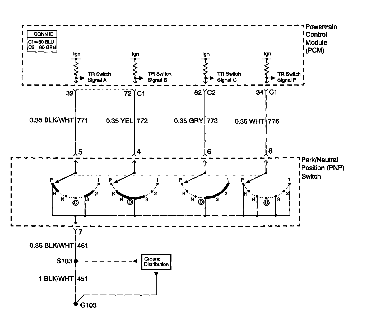 The transmission range (TR) switch is part of the park/neutral position (PNP) and back-up lamp switch assembly, which is externally mounted on the transmission manual shaft. The TR switch contains four internal switches that indicate the transmission gear range selector lever position. The powertrain control module (PCM) supplies ignition voltage to each switch circuit. As the gear range selector lever is moved, the state of each switch may change, causing the circuit to open or close. An open circuit or switch indicates a high voltage signal. A closed circuit or switch indicates a low voltage signal. The PCM detects the selected gear range by deciphering the combination of the voltage signals. The PCM compares the actual voltage combination of the switch signals to a TR switch combination chart stored in memory.