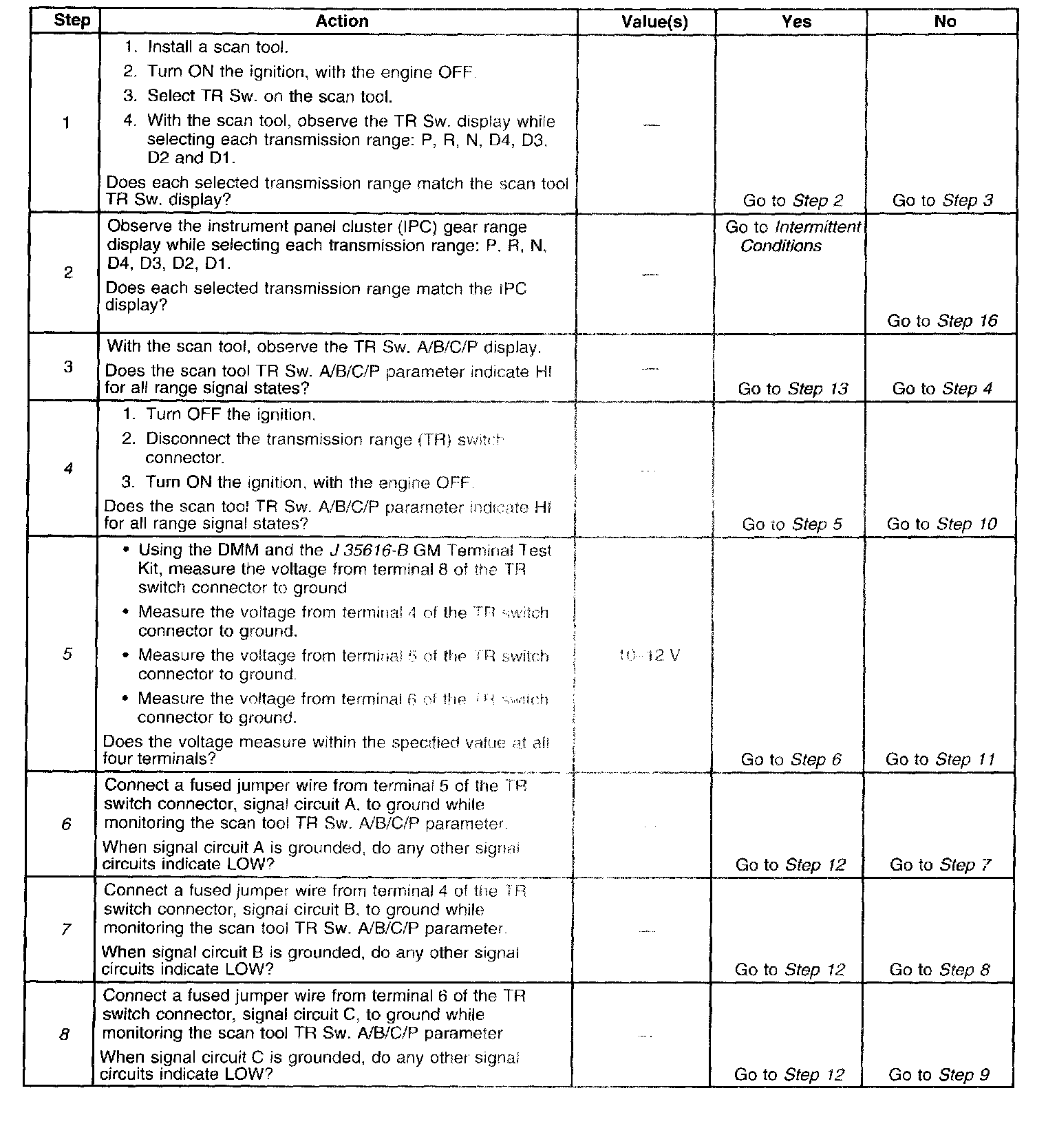 5. This step tests the TR switch wiring for an open or the lack of the signal voltage from the PCM.