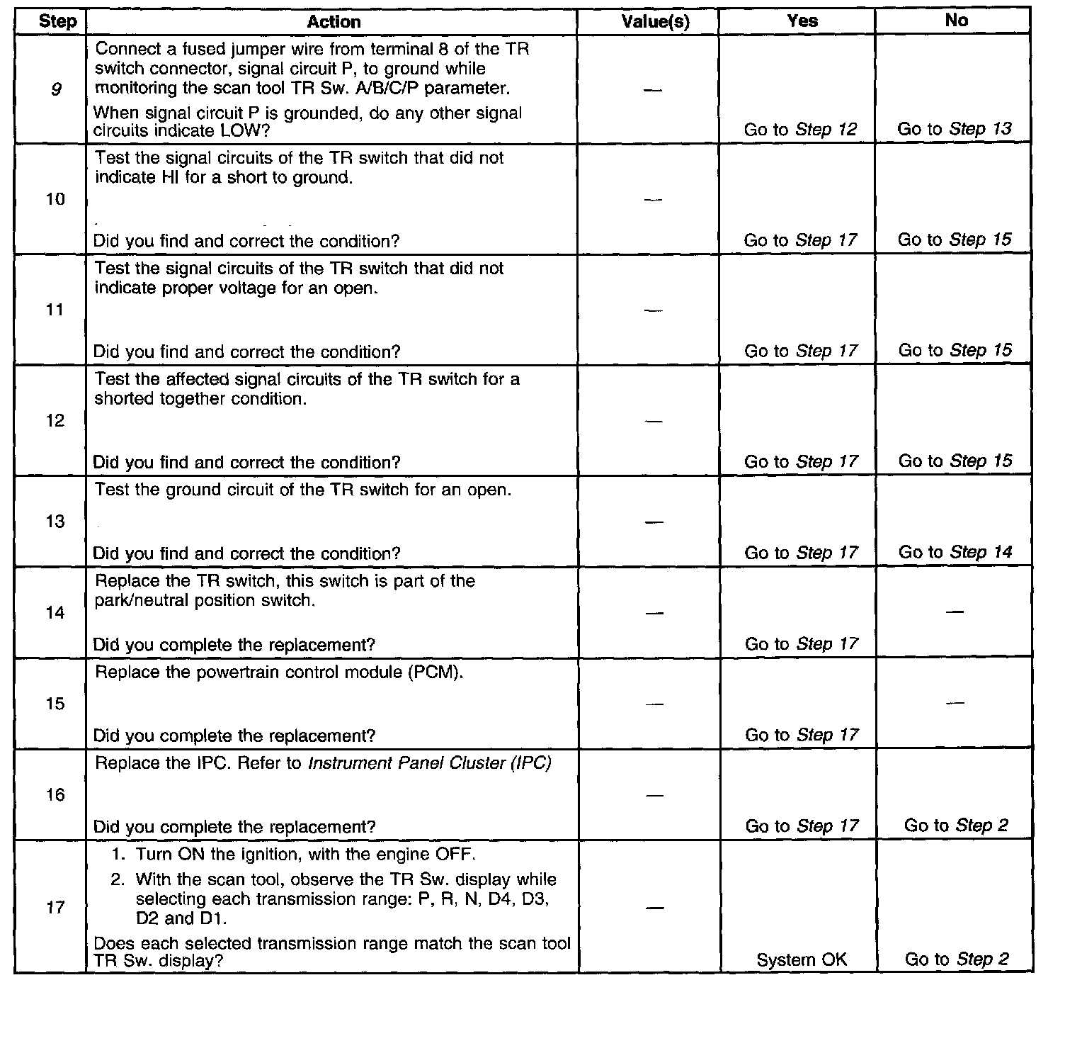 9. This step tests the TR switch wiring and the PCM by providing a ground path through a fused jumper wire. When grounded, the scan tool range signal states should change to LOW.