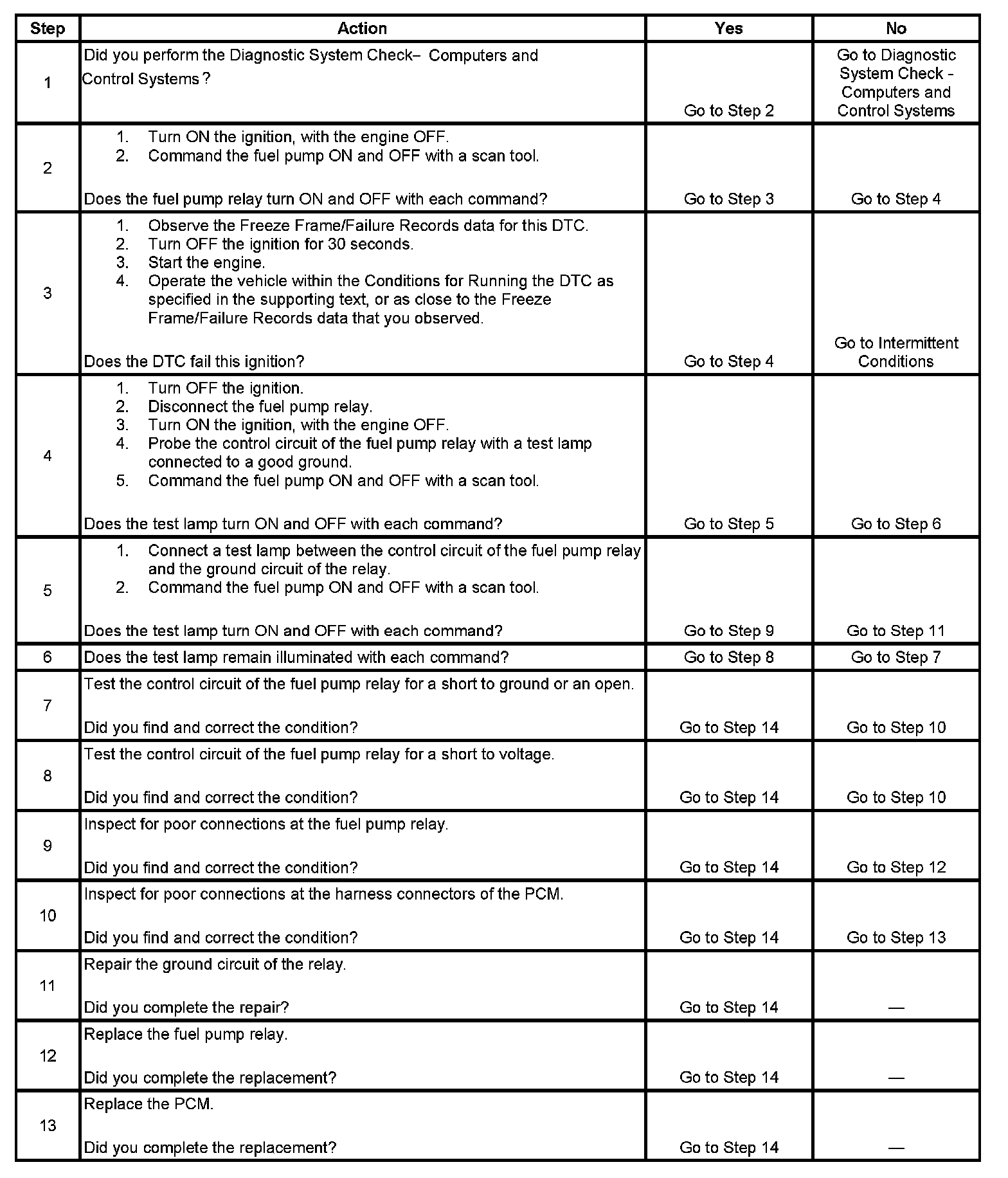 6. This step tests if voltage is constantly being applied to the control circuit of the fuel pump relay.