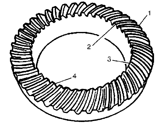 The side of the ring gear tooth which curves outward, or is convex, is the drive side (4). The concave side is the coast side (3). The end of the tooth nearest the center of the ring gear is the toe end (2). The end of the tooth farthest away from the center is the heel end ( 1).