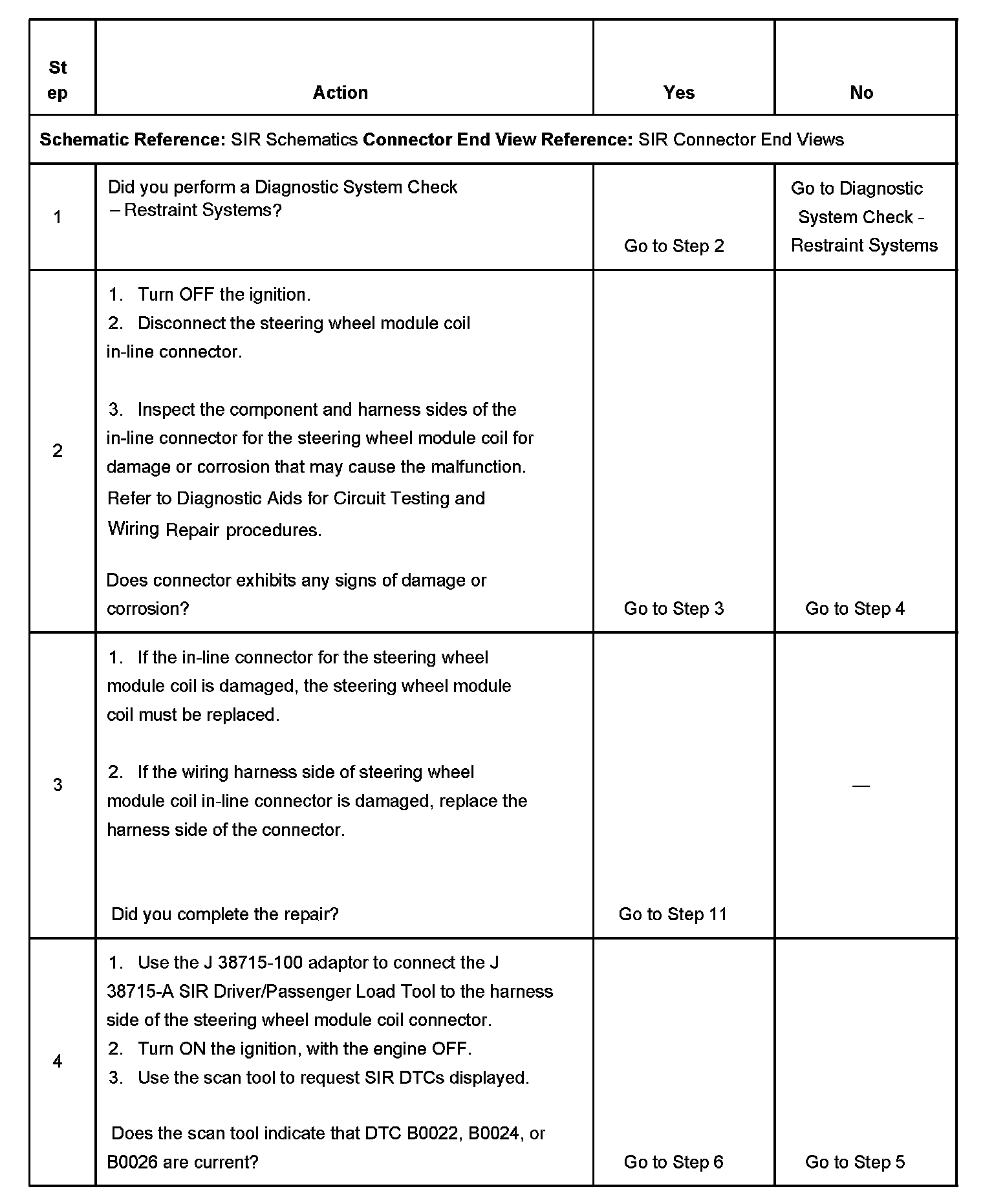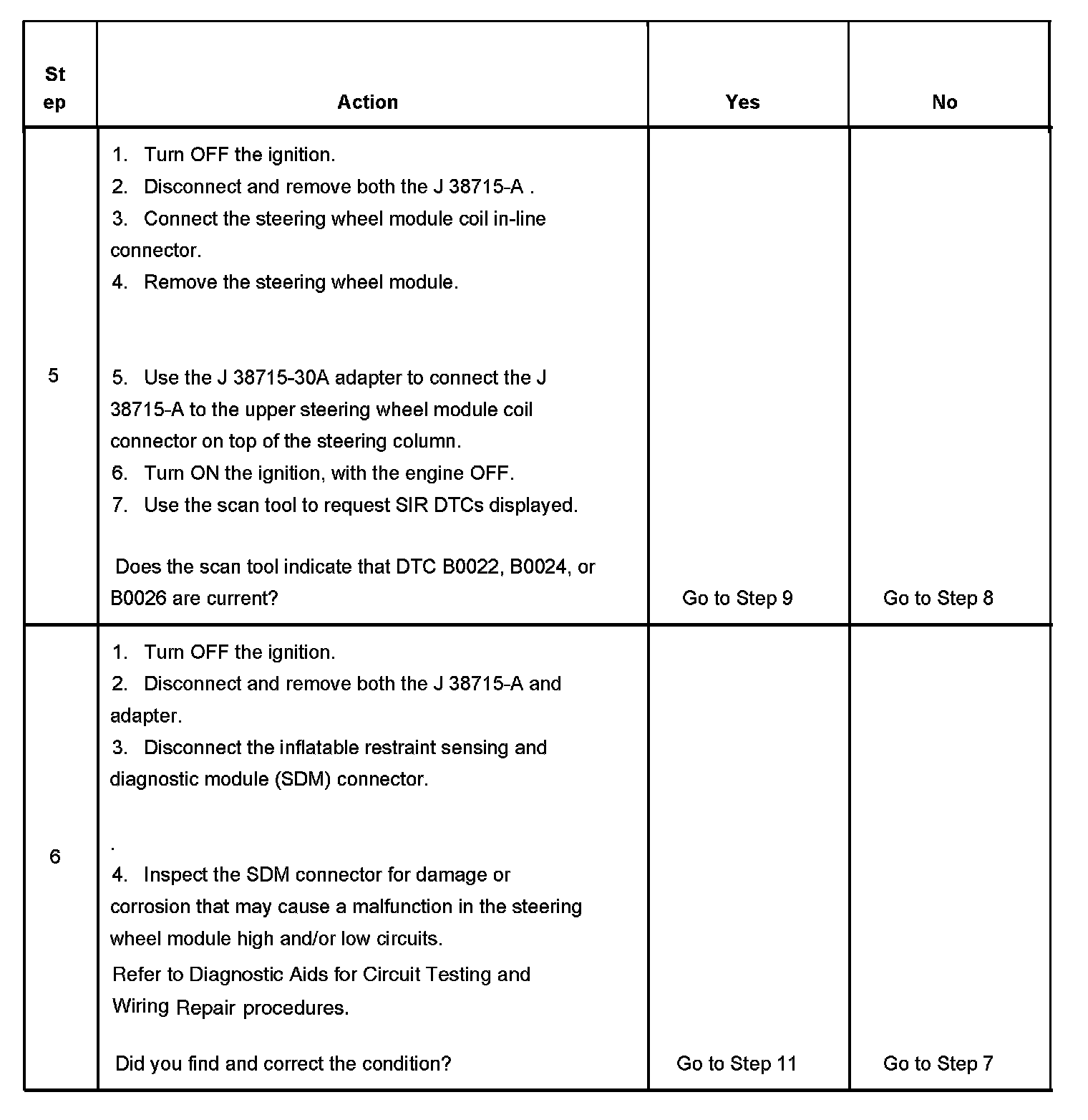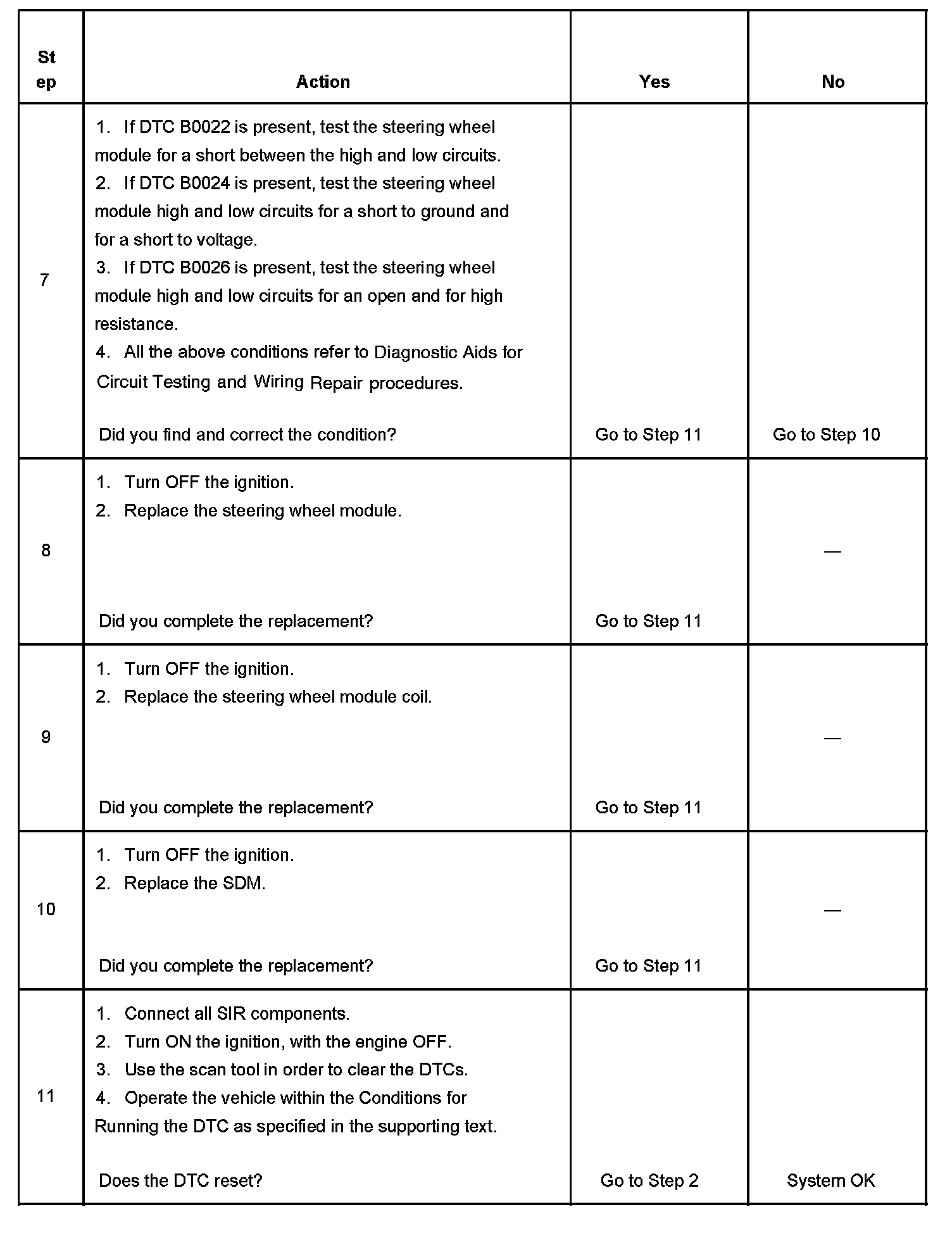 7. Tests to see what DTCs are present. If DTC B0022 is present, test the steering wheel module for a short between high and low circuits. If DTC B0024 is present, test the steering wheel module high and low circuits for an open and for high resistance. If DTC B0026 is present, test the steering wheel module high and low circuits for an open and for high resistance.