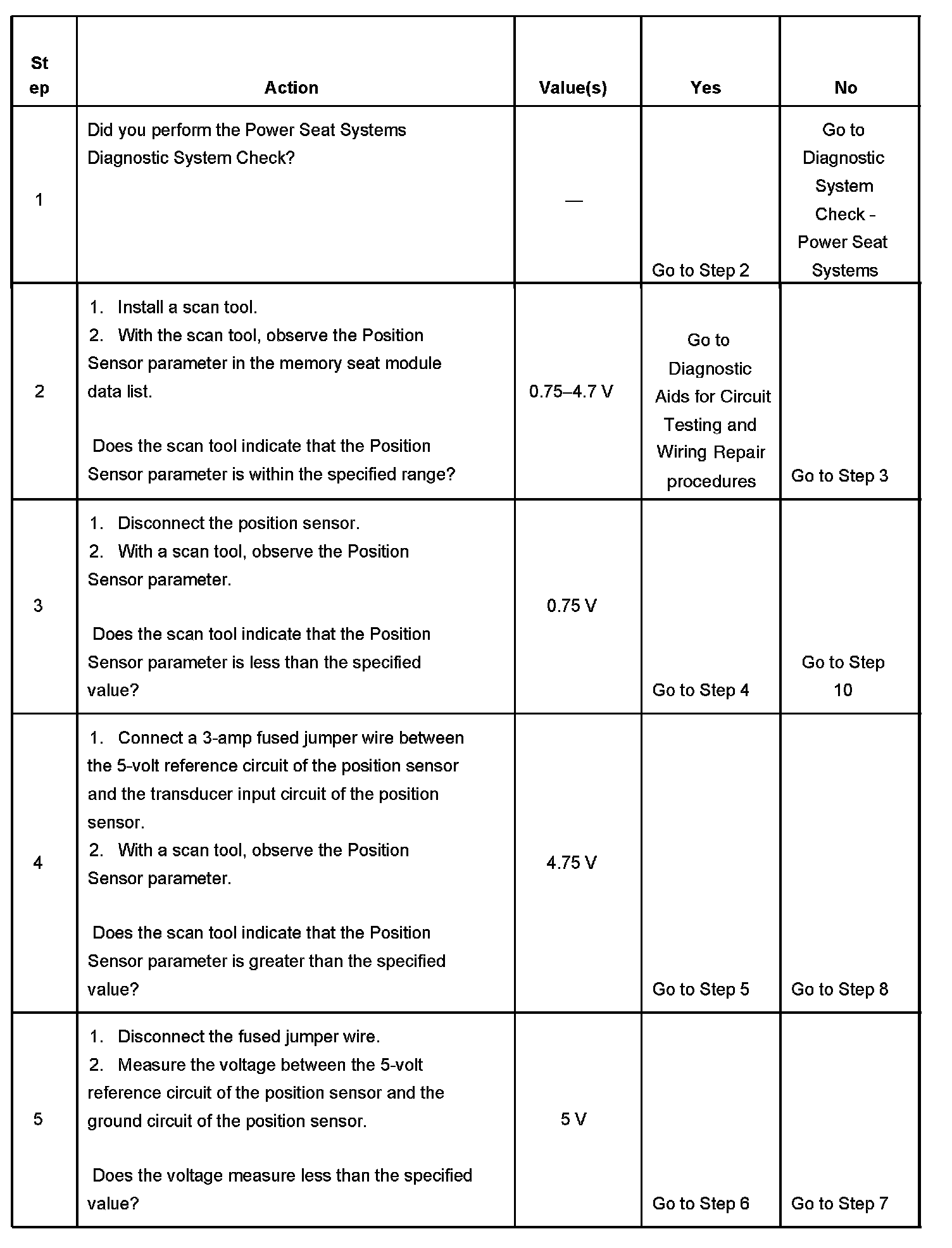 Three of the seat adjuster motors are equipped with position sensors (transducers). They are the horizontal motor, front vertical motor and the rear vertical motor. The position sensors (transducers) are supplied with a 5-volt reference circuit and ground circuit from the memory seat module. The memory seat module receives a transducer input voltage from each position sensor (transducer) whenever a memory seat module output function is active.