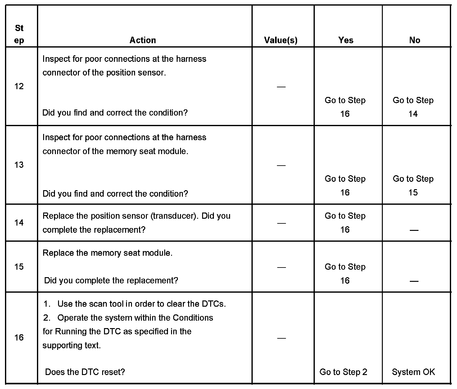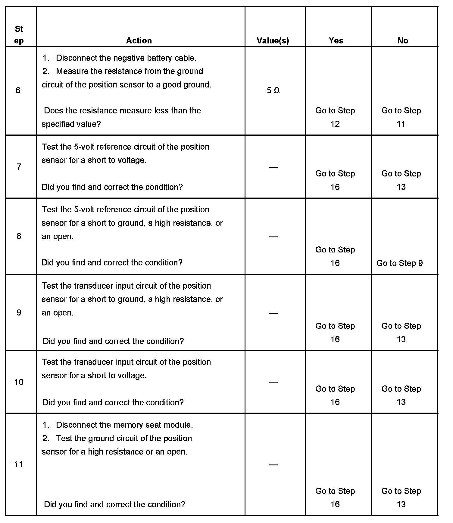The memory seat module detects the transducer input circuit under 0.75 volts or over 4.78 volts.