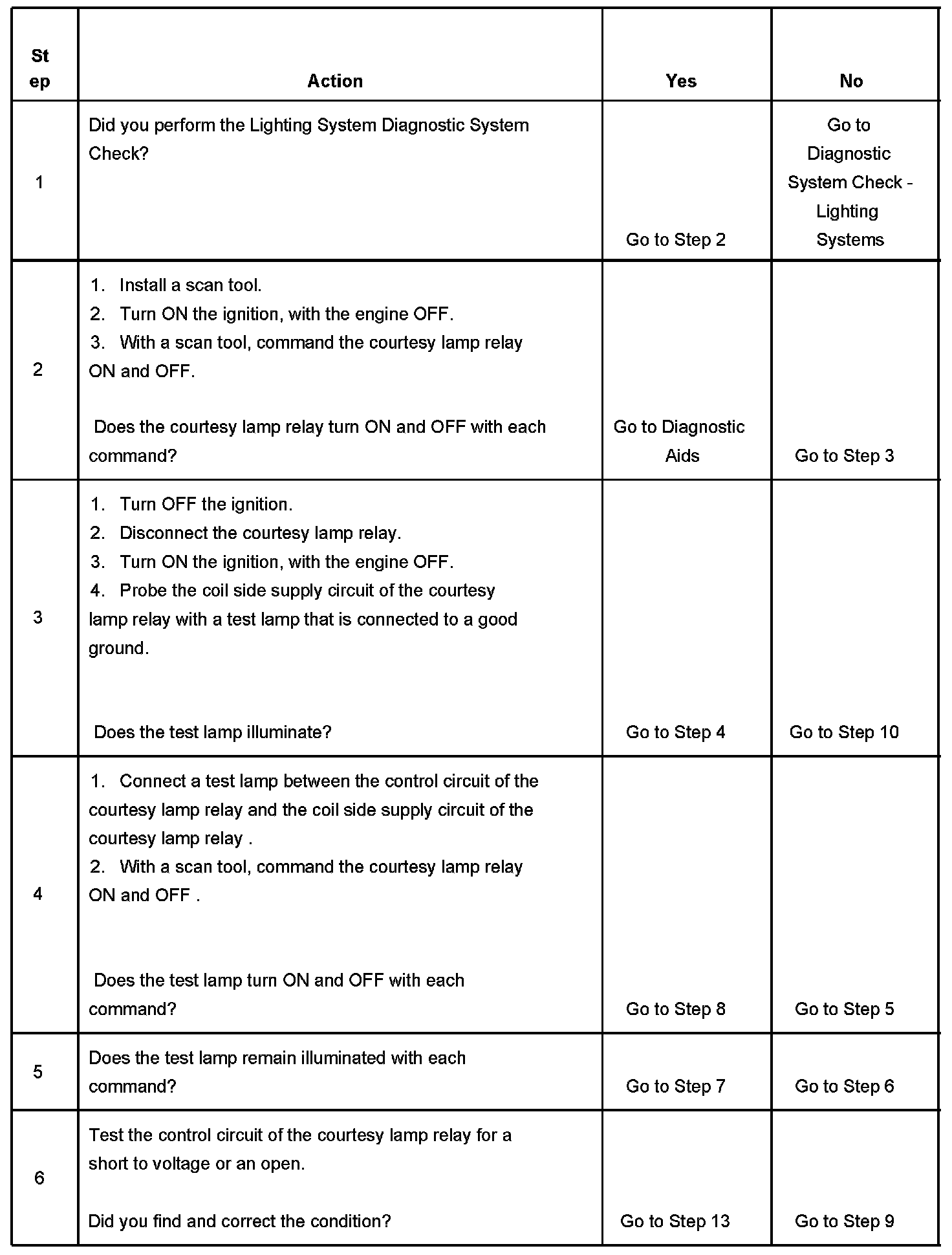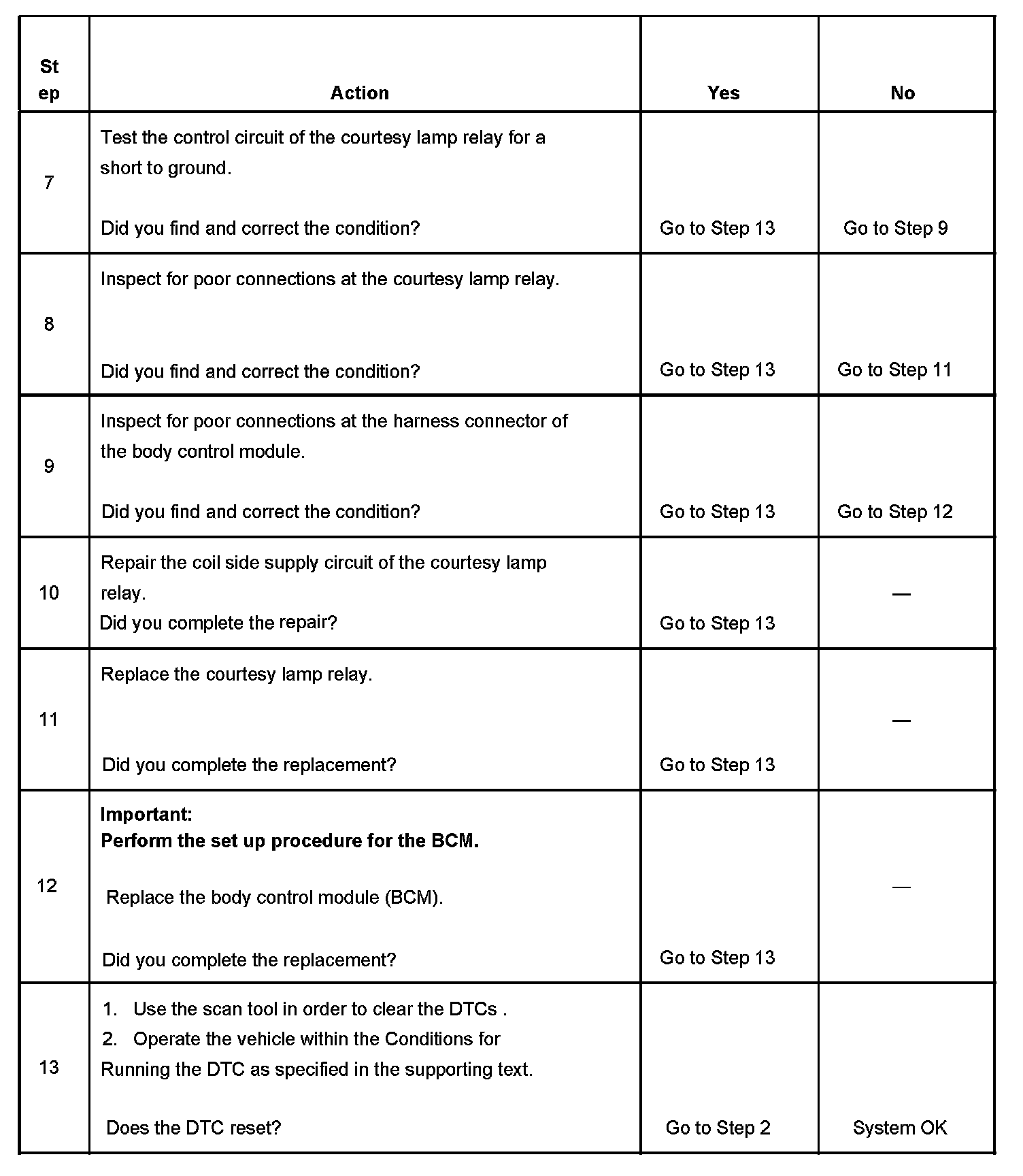- The courtesy lamp relay coil control circuit is open or shorted to ground.