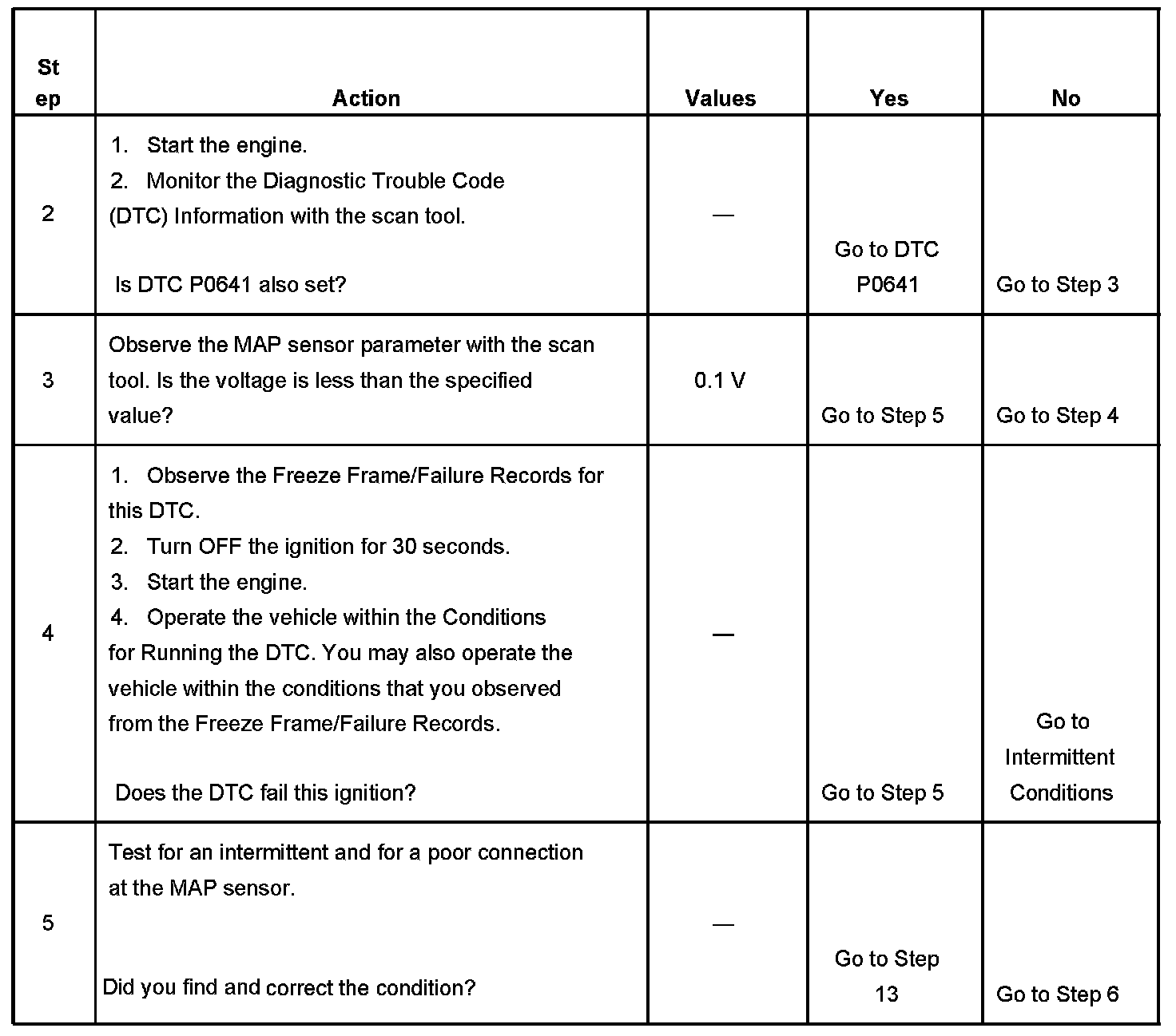 The PCM detects that the MAP sensor voltage is less than 0.10 volt for more than 2 seconds.