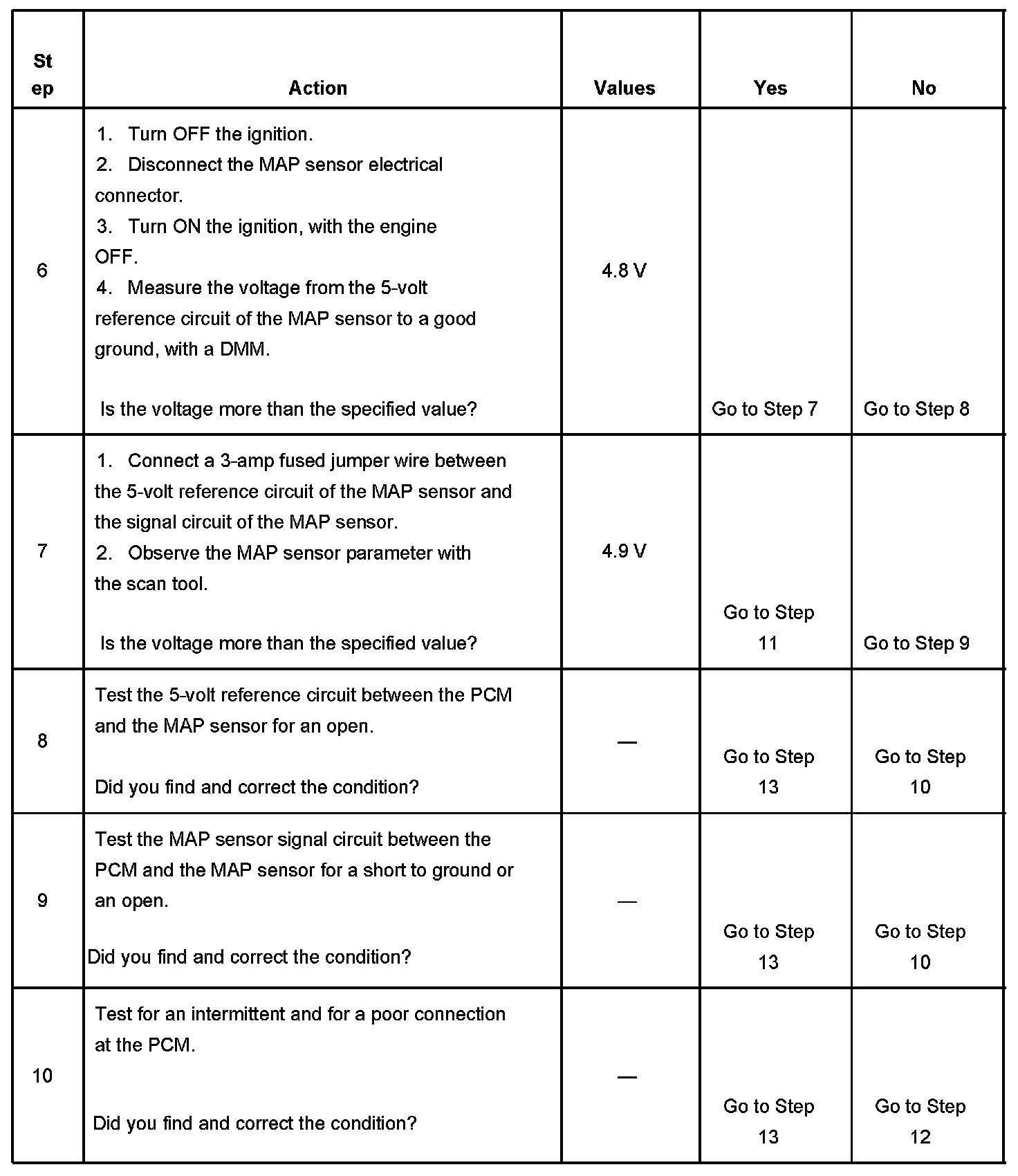 The powertrain control module (PCM) supplies 5 volts to the MAP sensor on the 5-volt reference circuit. The PCM also provides a ground on the low reference circuit. The MAP sensor provides a signal to the PCM on the MAP sensor signal circuit which is relative to the pressure changes in the manifold. The PCM should detect a low signal voltage at a low MAP, such as during an idle or a deceleration. The PCM should detect a high signal voltage at a high MAP, such as the ignition is ON, with the engine OFF, or at a wide open throttle (WOT). The MAP sensor is also used in order to determine the barometric pressure (BARO). This occurs when the ignition switch is turned ON, with the engine OFF. The BARO reading may also be updated whenever the engine is operated at WOT. The PCM monitors the MAP sensor signal for voltage outside of the normal range.