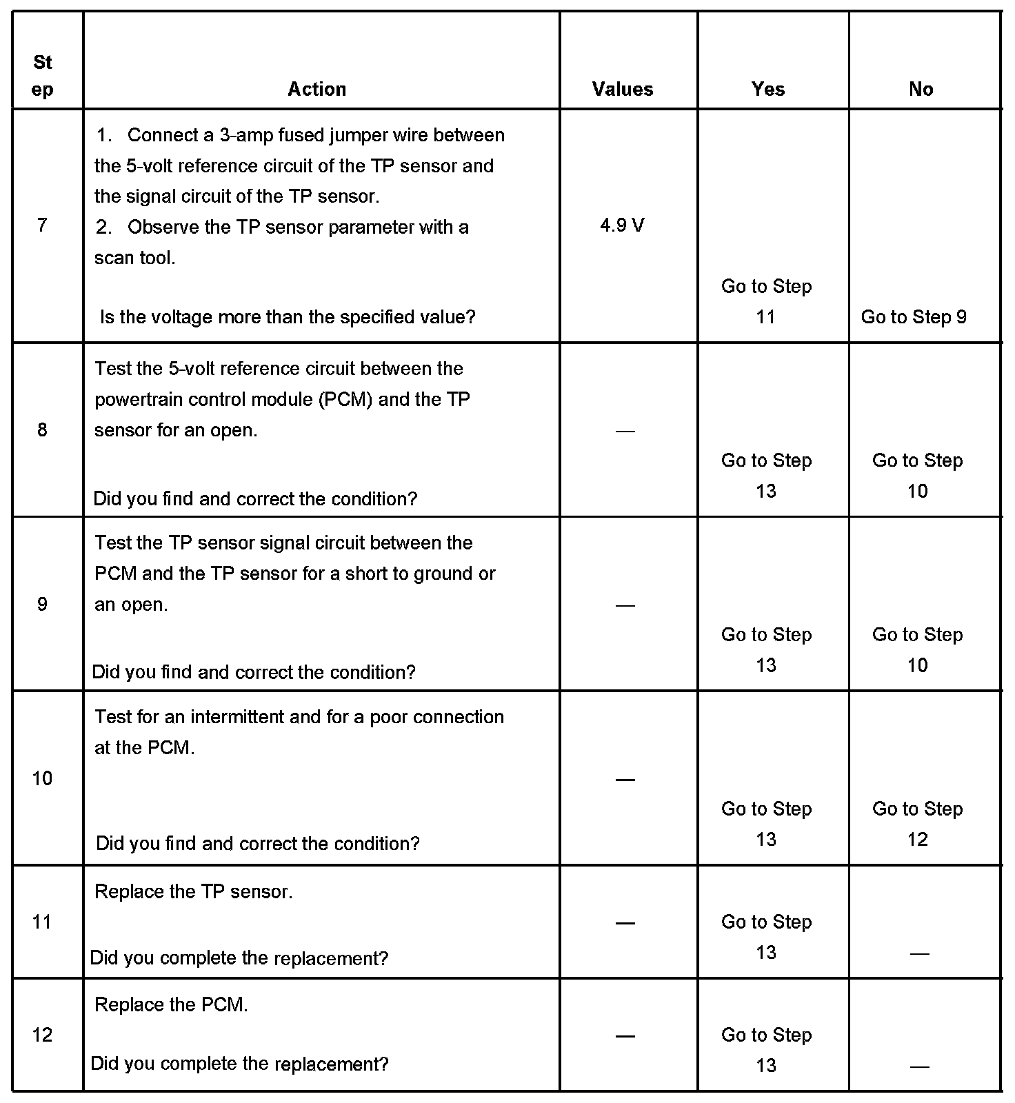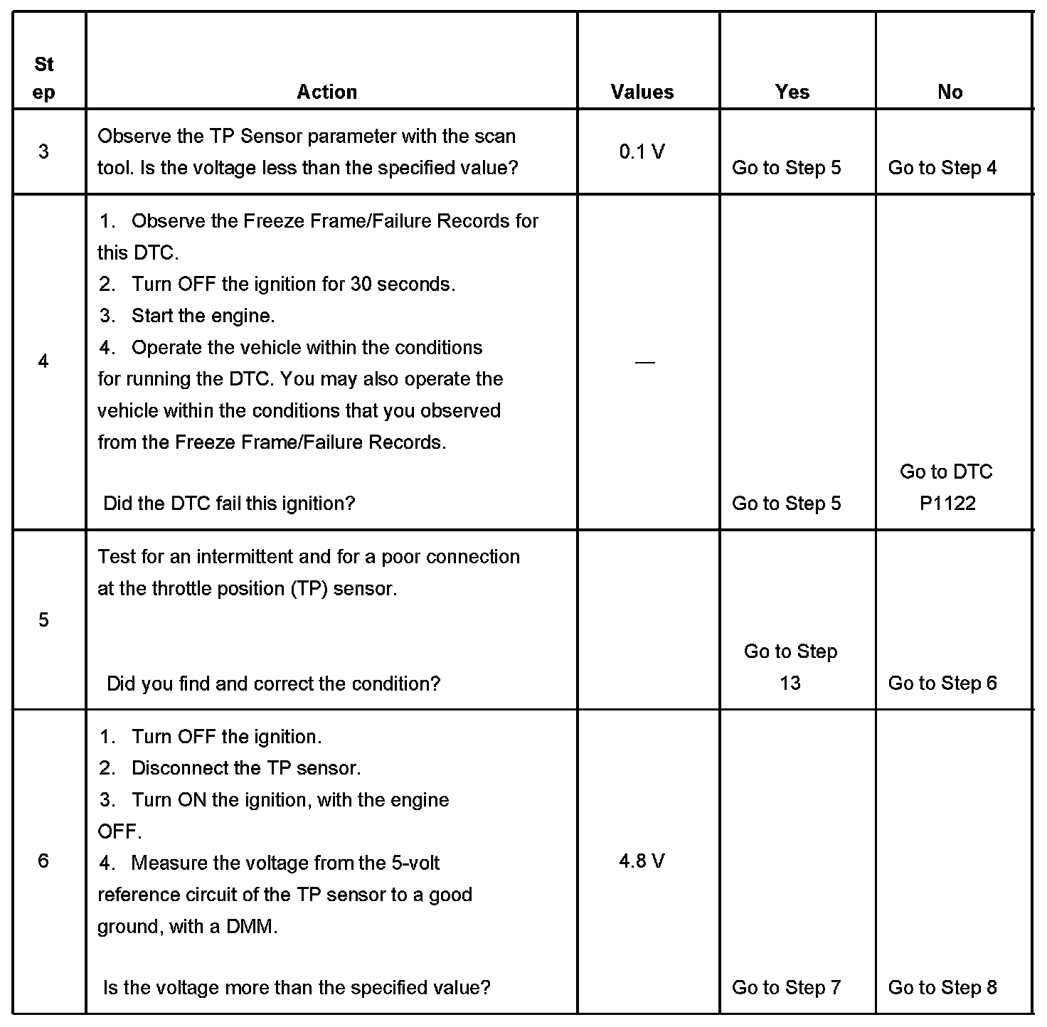 The PCM provides the TP sensor with 5 volts on the 5-volt reference circuit and a ground on the low reference circuit. Rotation of the TP sensor rotor from the closed throttle position to the wide open throttle (WOT) position provides the PCM with a signal voltage from less than 1 volt to more than 4 volts through the TP sensor signal circuit. If the PCM detects an excessively low signal voltage, DTC P0122 sets.