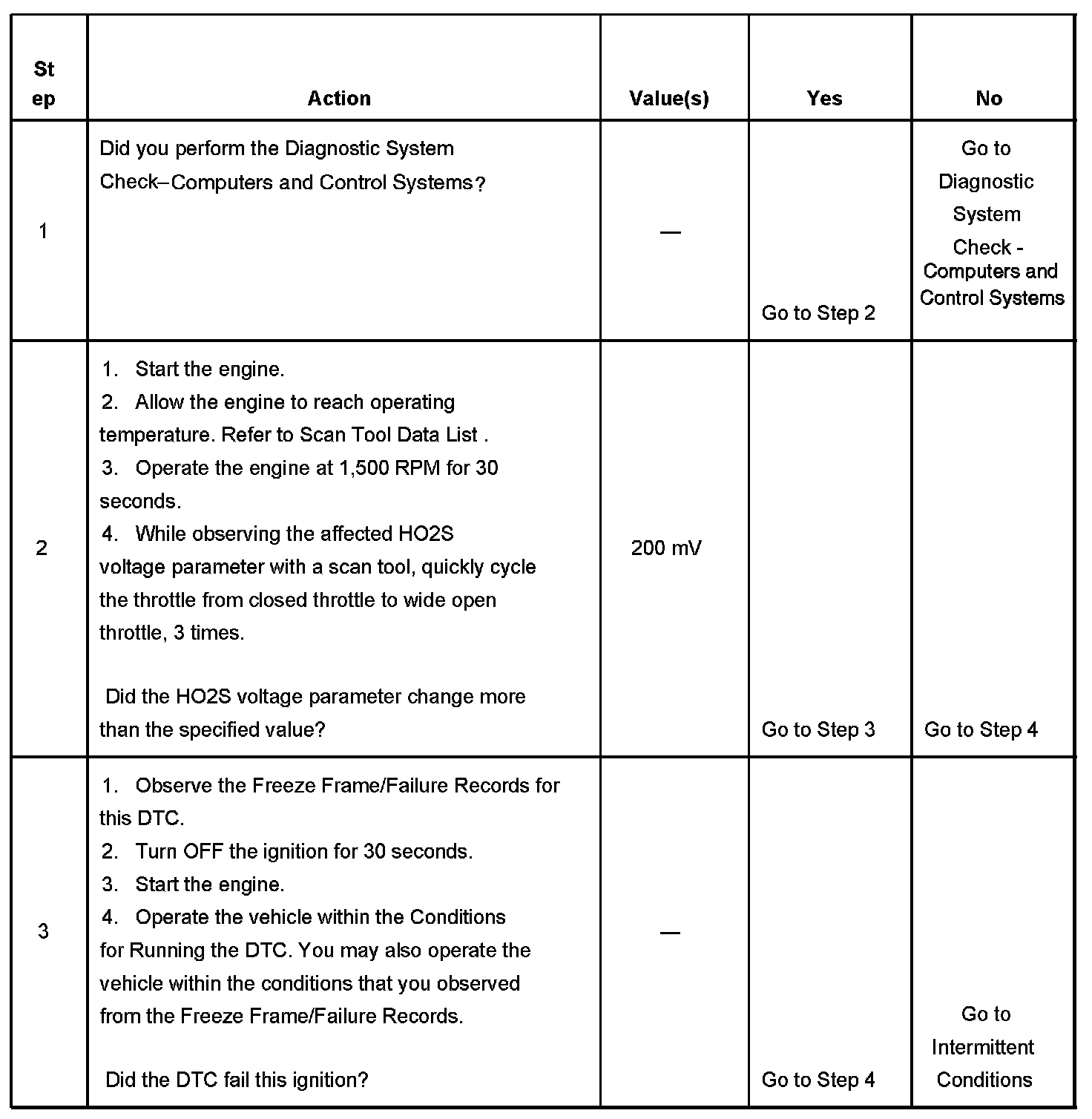 The HO2S bank 1 sensor 2 is used for catalyst monitoring. This diagnostic runs once per ignition cycle. This diagnostic consists of two tests, a passive test and an intrusive test. During the passive test, if the HO2S bank 1 sensor 2 voltage transitions below 350 mV and above 709 mV, the DTC will pass for this ignition cycle. If the DTC does not pass during the passive test, the intrusive test will begin. During the intrusive test, the control module will force the air-to-fuel ratio rich and/or lean. The control module then waits for a predicted response from the HO2S. If the HO2S voltage transitions below 350 mV and/or above 709 mV, the DTC will pass for this ignition cycle. If the control module does not receive the expected response from the HO2S, DTC P0136 will set for HO2S bank 1 sensor 2.
