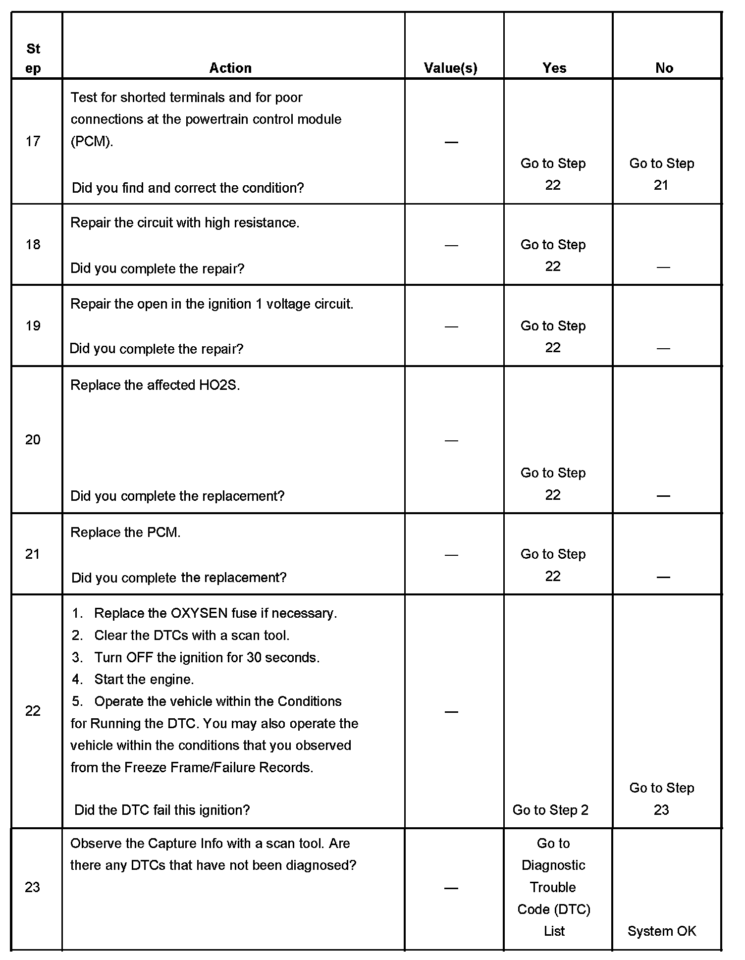 The heated oxygen sensor (HO2S) must reach operating temperature to provide an accurate voltage signal. A heating element inside the HO2S minimizes the time required for the sensor to reach operating temperature. Voltage is provided to the heater by the ignition 1 voltage circuit through a fuse. With the engine running, ground is provided to the heater by the HO2S heater low control circuit, through a low side driver within the powertrain control module (PCM). The PCM commands the heater ON or OFF to maintain a specific HO2S operating temperature range. The PCM determines the temperature by measuring the current flow through the heater. When the heater is in the ON state, the PCM will pulse the heater OFF for a duration of 50 ms, once per second. When the heater is in the OFF state, the PCM will pulse the heater ON for a duration of 50 ms, once per second. The PCM monitors the heater current with the engine running. The PCM also calculates the heater resistance on a cold start. Both diagnostics will only run once per ignition cycle. If the PCM detects that the heater current or the heater calculated resistance is not within an expected range, the following DTCs will set: