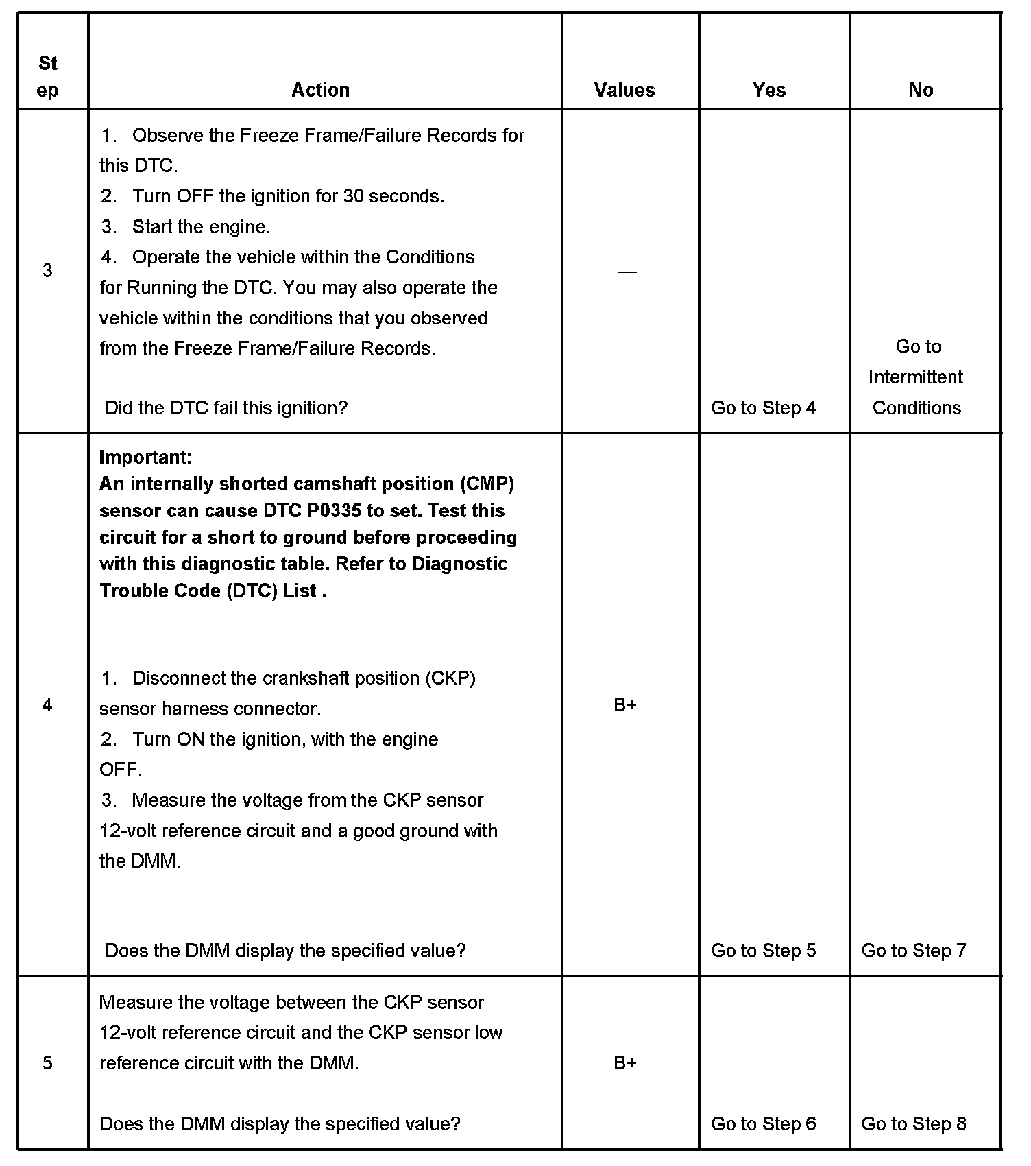If the PCM detects no signal from the CKP sensor for more than 3 seconds, DTC P0335 sets.