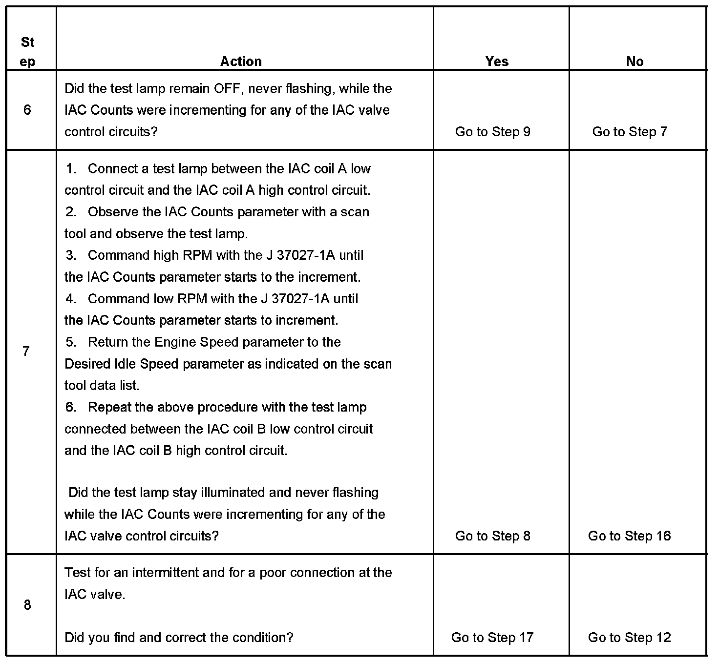 7. This test will determine the ability of the PCM to provide the IAC valve control circuits with a ground. On a normally operating system, the test lamp should not flash while the IAC Counts are incrementing.
