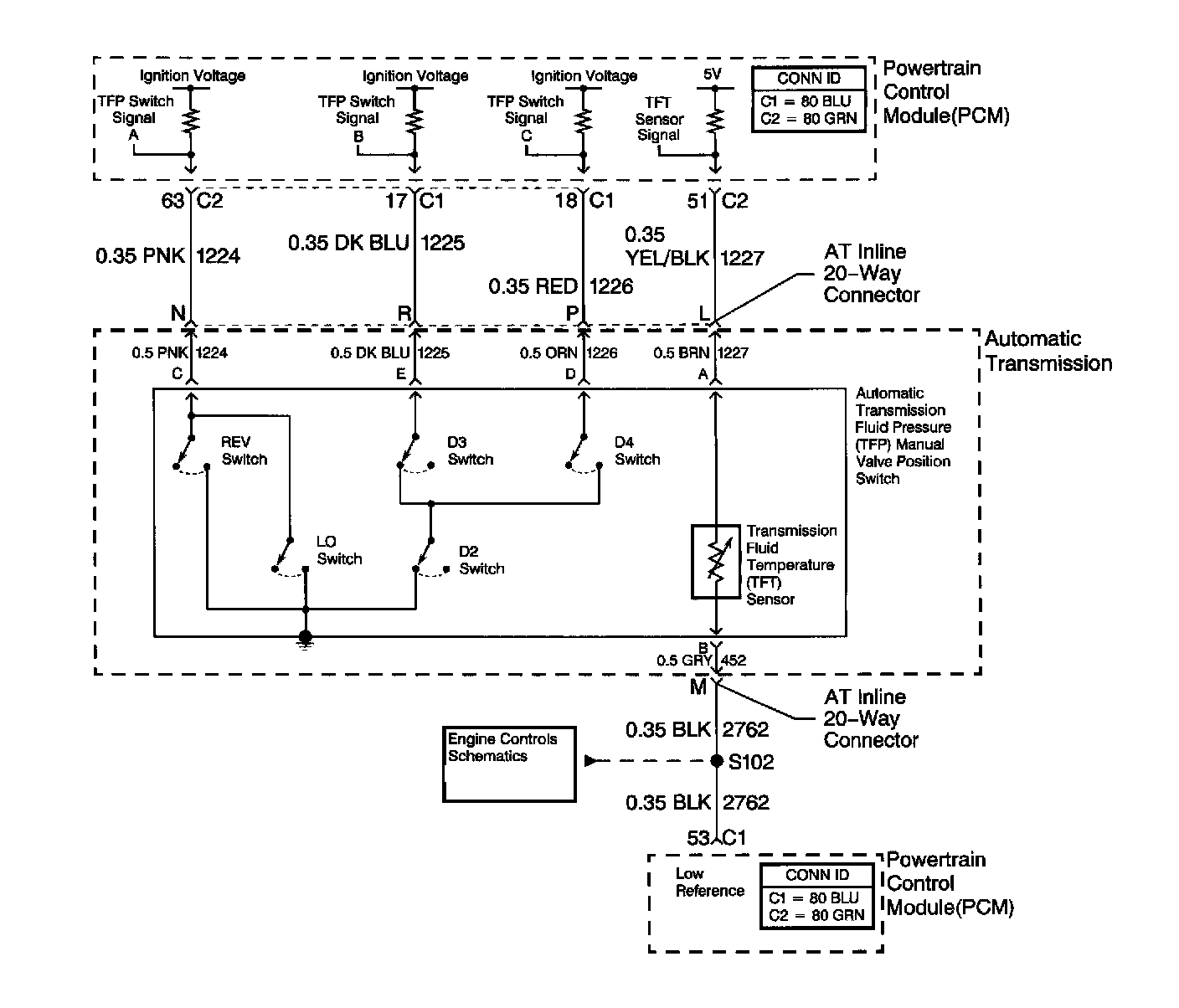 The automatic Transmission Fluid Temperature (TFT) sensor is part of the automatic Transmission Fluid Pressure (TFP) manual valve position switch. The TFT sensor is a resistor, or thermistor, which changes value based on temperature. The sensor has a negative-temperature coefficient. This means that as the temperature increases, the resistance decreases, and as the temperature decreases, the resistance increases. The Powertrain Control Module (PCM) supplies a 5-volt reference signal to the sensor on the TFT sensor signal circuit and measures the voltage drop in the circuit. When the transmission fluid is cold, the sensor resistance is high and the PCM detects high signal voltage. As the fluid temperature warms to a normal operating temperature, the resistance becomes less and the signal voltage decreases. The PCM uses this information to control shift quality and torque converter clutch apply.