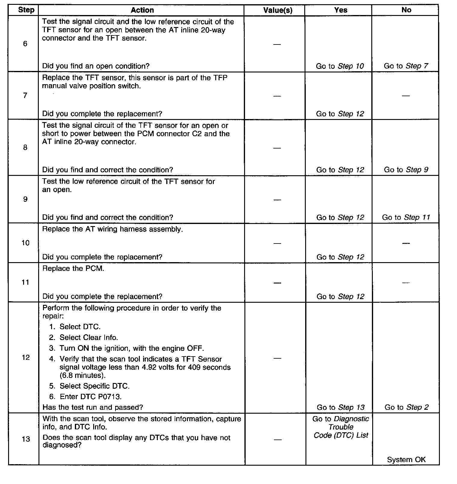 When the PCM detects a continuous open or short to power in the TFT signal circuit or the TFT sensor, then DTC P0713 sets. DTC P0713 is a type C DTC.