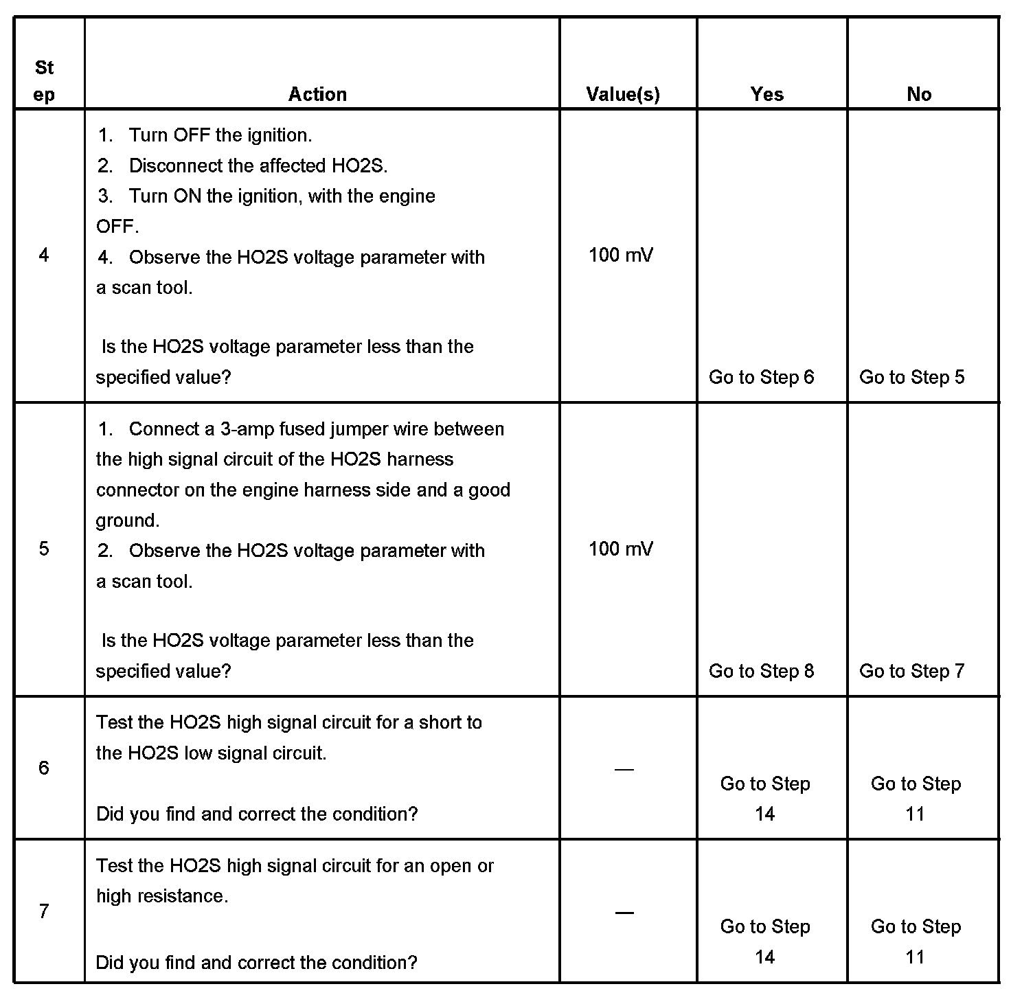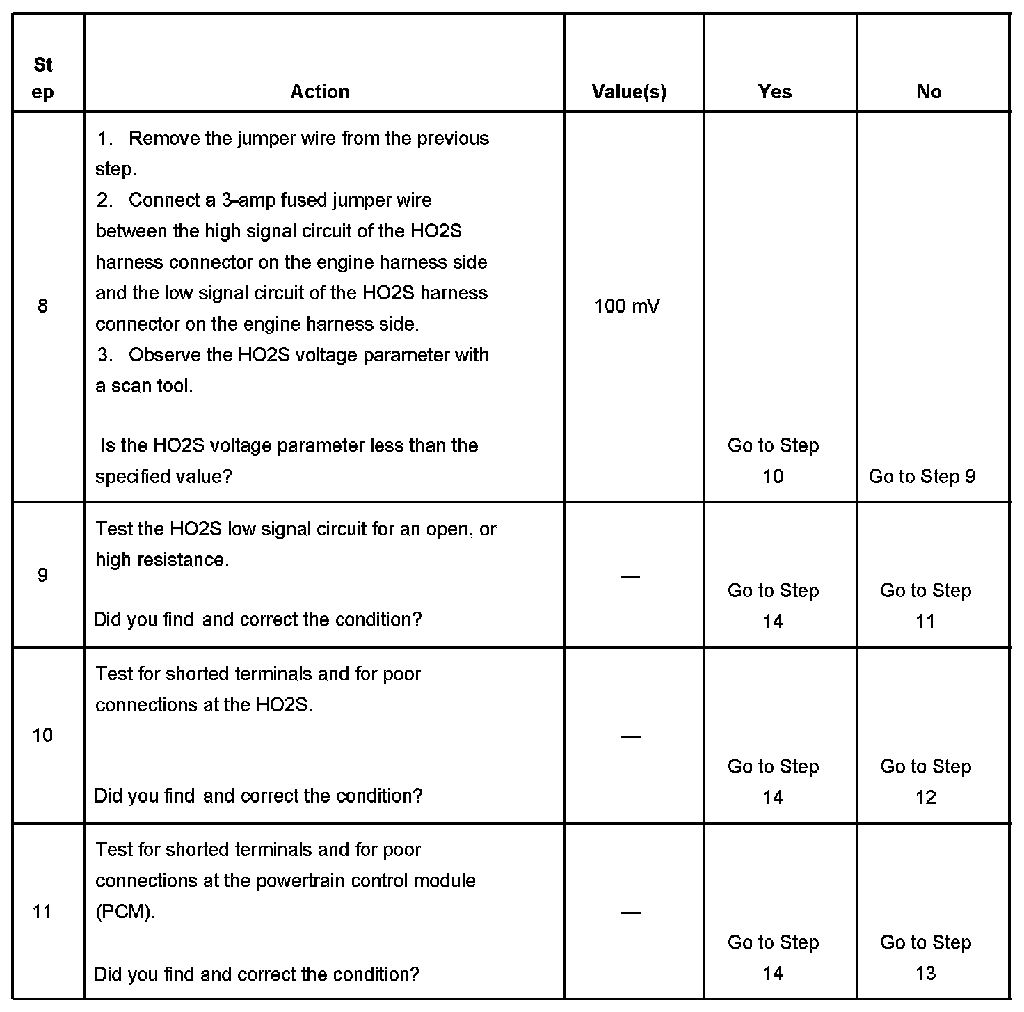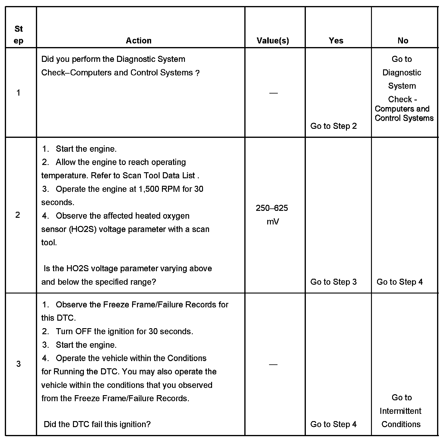 Heated oxygen sensors (HO2S) are used for fuel control and post catalyst monitoring. Each HO2S compares the oxygen content of the surrounding air with the oxygen content in the exhaust stream. The HO2S must reach operating temperature to provide an accurate voltage signal. Heating elements inside the HO2S minimize the time required for the sensors to reach operating temperature. The powertrain control module (PCM) supplies the HO2S with a reference, or bias, voltage of about 450 mV. When the engine is first started the PCM operates in open loop, ignoring the HO2S voltage signal. Once the HO2S reaches operating temperature and closed loop is achieved, the HO2S generates a voltage within a range of 0-1,000 mV that fluctuates above and below bias voltage. High HO2S voltage indicates a rich exhaust stream; low HO2S voltage indicates a lean exhaust stream. This diagnostic will only run once per ignition cycle. The PCM monitors the number of rich-to-lean and lean-to-rich transitions. If the PCM detects that the number of transitions were less than a specified value, DTC P1133 sets for HO2S bank 1 sensor 1, or DTC P1153 sets for HO2S bank 2 sensor 1.