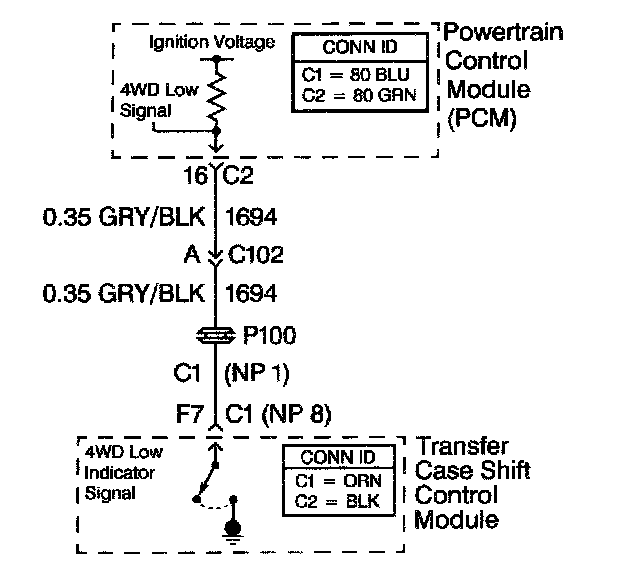 The Four Wheel Drive (4WD) low circuit consists of the Powertrain Control Module (PCM), a Transfer Case Control Module (TCCM) and the circuit wiring. The TCCM controls the 4WD low signal on the signal circuit. When the operator selects 4WD low, the TCCM grounds the signal circuit and the 4WD low signal voltage on the circuit changes from ignition voltage to zero volts. The PCM then compensates for transfer case gear reduction in the transmission Output Shaft Speed (OSS) signal. The PCM uses the transmission OSS signal to adjust shift points, line pressure and Torque Converter Clutch (TCC) scheduling.