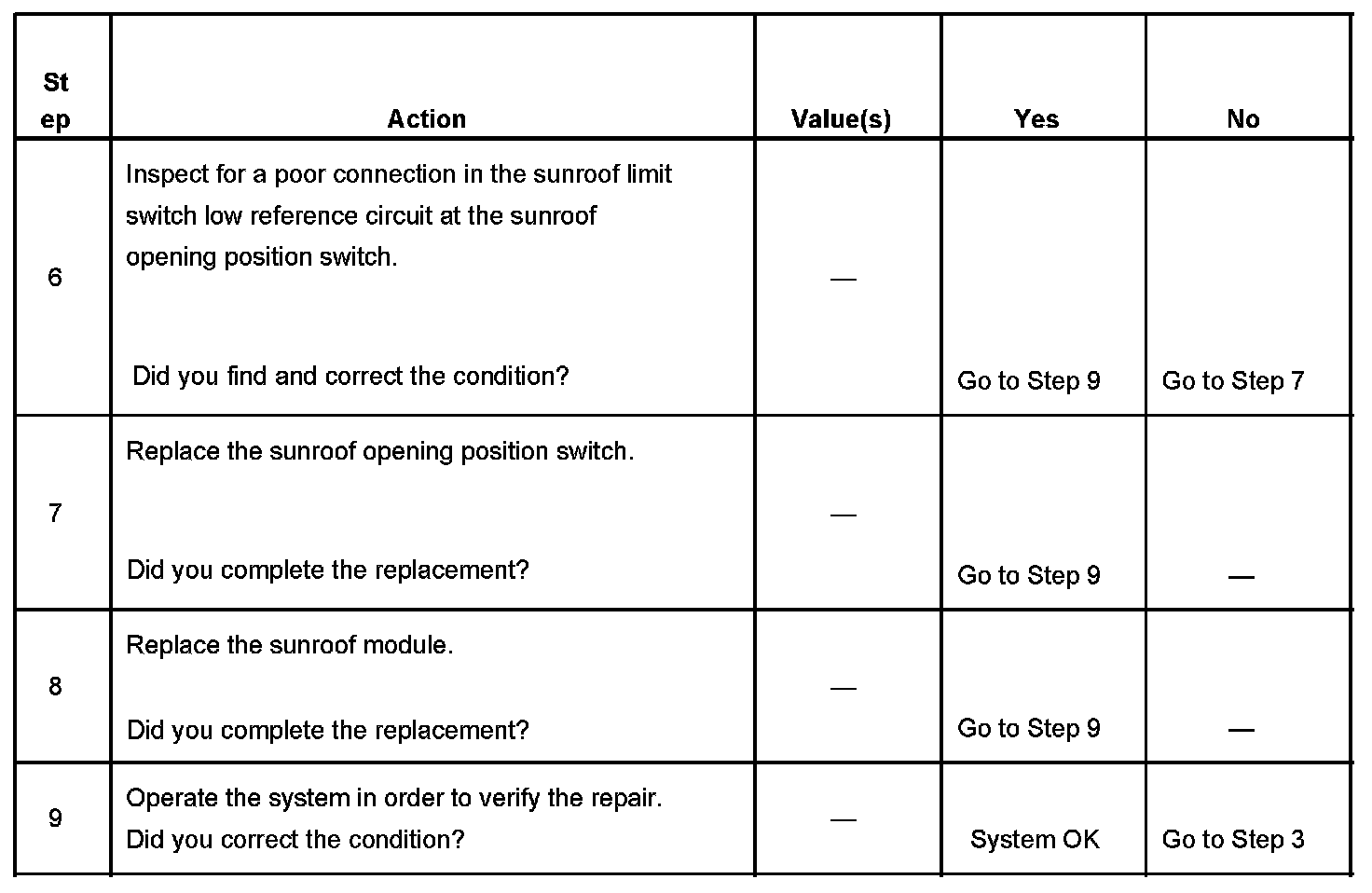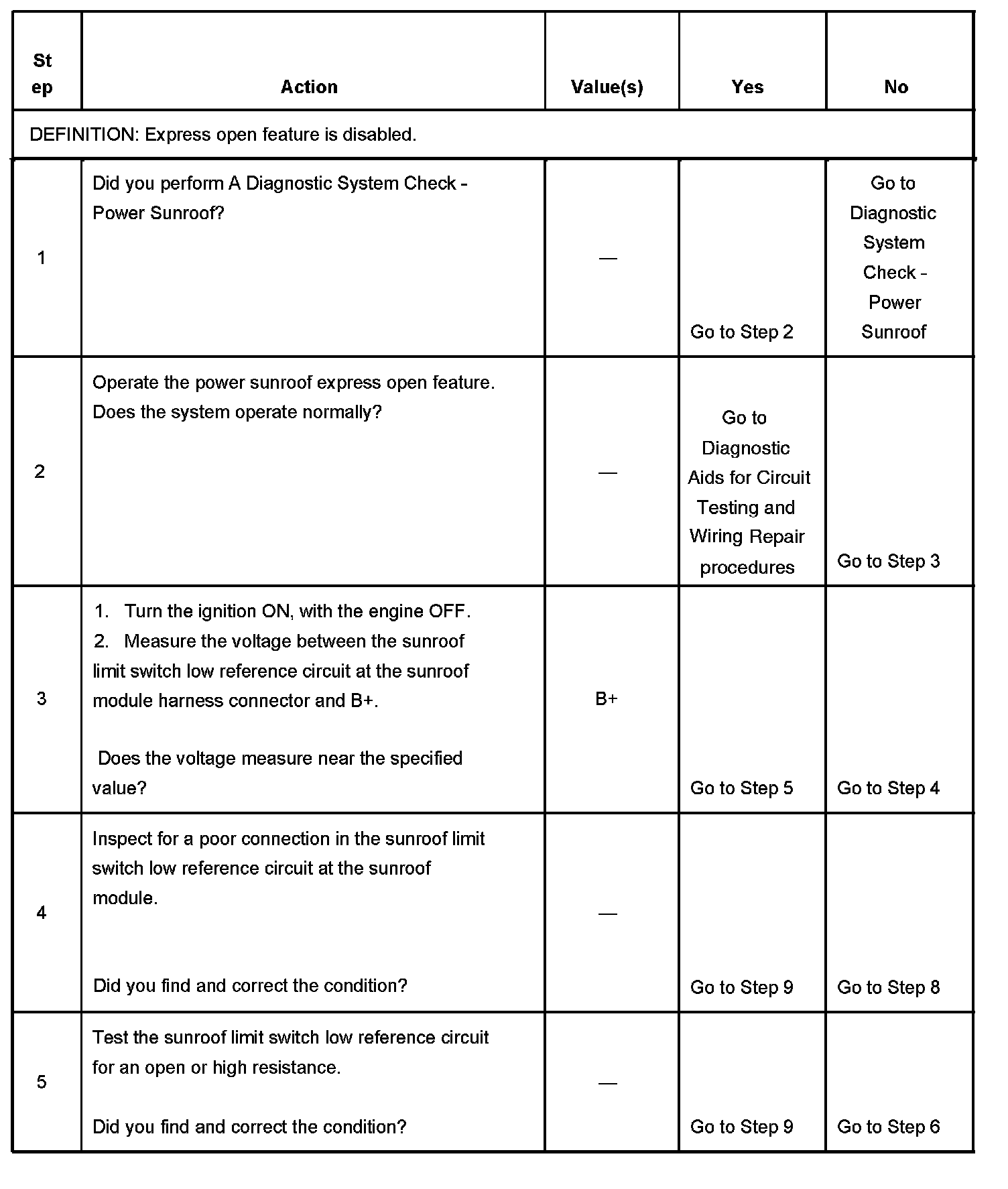 2. This step will test the express open feature and if the feature is operating properly, then inspect the sunroof limit switch low reference circuit for an intermittent or poor connection.