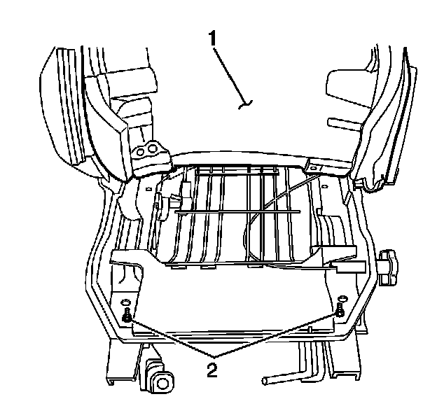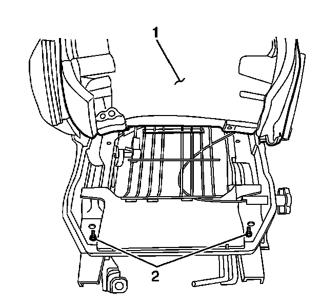 10. Pull the seat cover and cushion (1) up to expose the 4 seat frame mounting nuts (2).