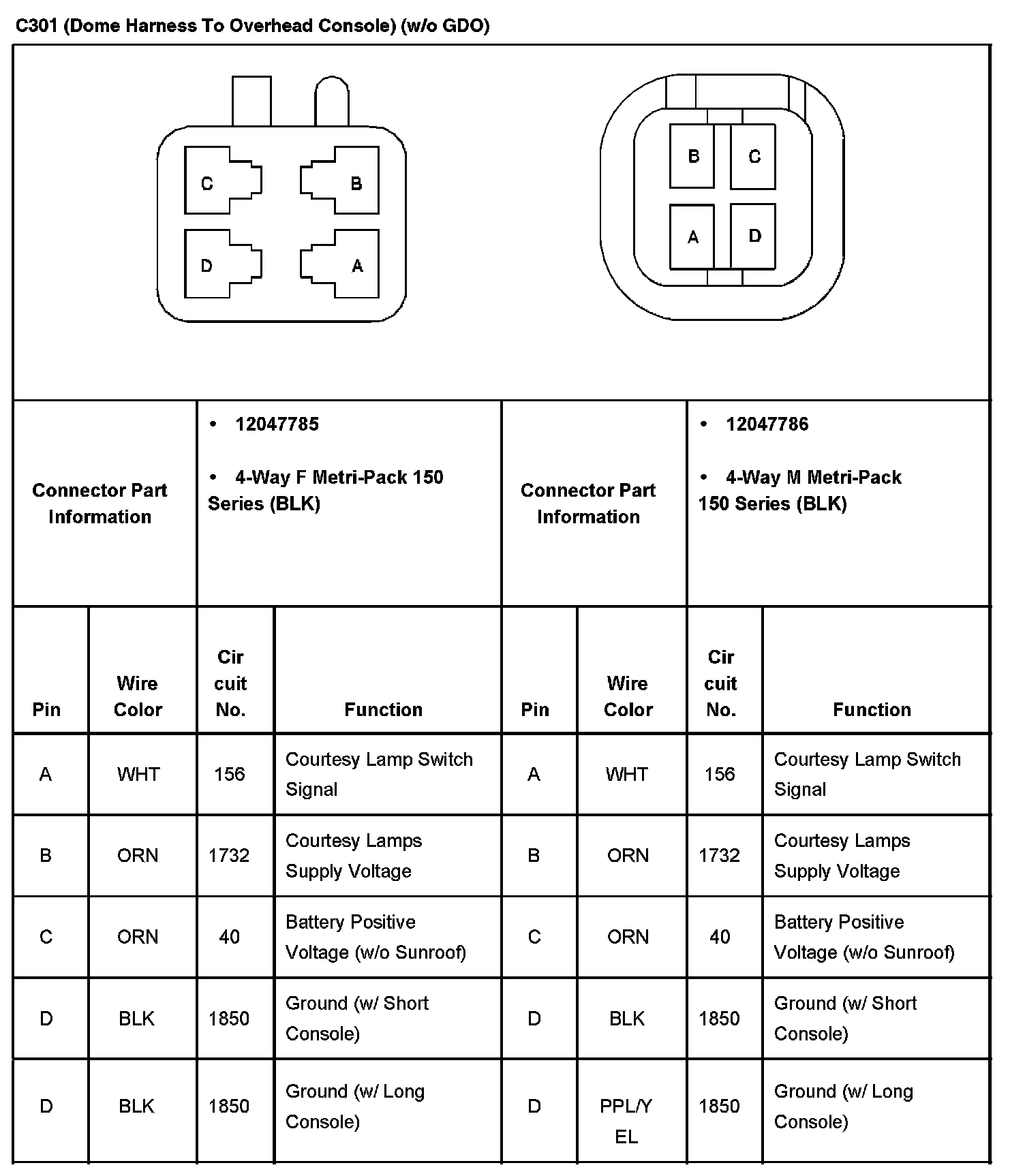 C301 (Dome Harness To Overhead Console) (Without RPO Code GDO):