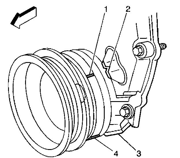 5. Rotate the crankshaft balancer to position the crankshaft balancer alignment mark (1) 57 - 63 degrees clockwise or counterclockwise from the engine front cover alignment tab (2).