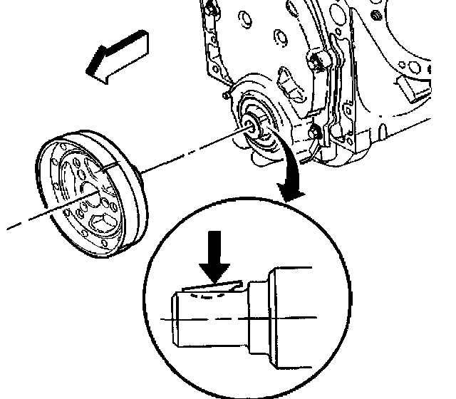 2. Apply a small amount of adhesive GM P/N 12346141 (Canadian P/N 10953433) or equivalent, onto the crankshaft balancer keyway in order to seal the crankshaft balancer keyway and crankshaft joint.