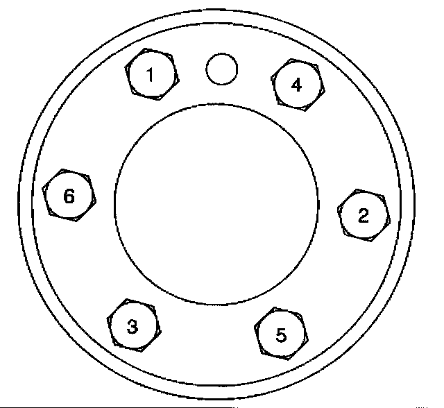 Tighten the engine flywheel bolts in sequence to 100 Nm (74 ft. lbs.).