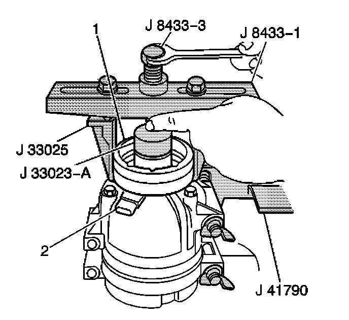 9. Tighten the center forcing screw J 8433-3 of the J 8433 against the J 33023-A to remove the A/C compressor clutch coil from the A/C compressor.