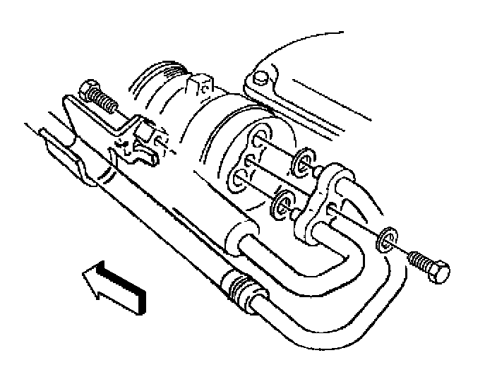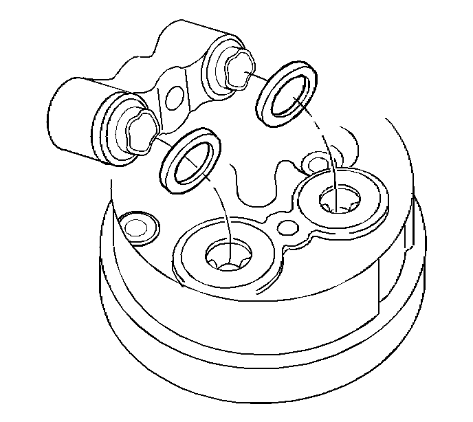 3. Install the hose block to the compressor. Ensure that the sealing washers are seated within the compressor's machined surfaces.