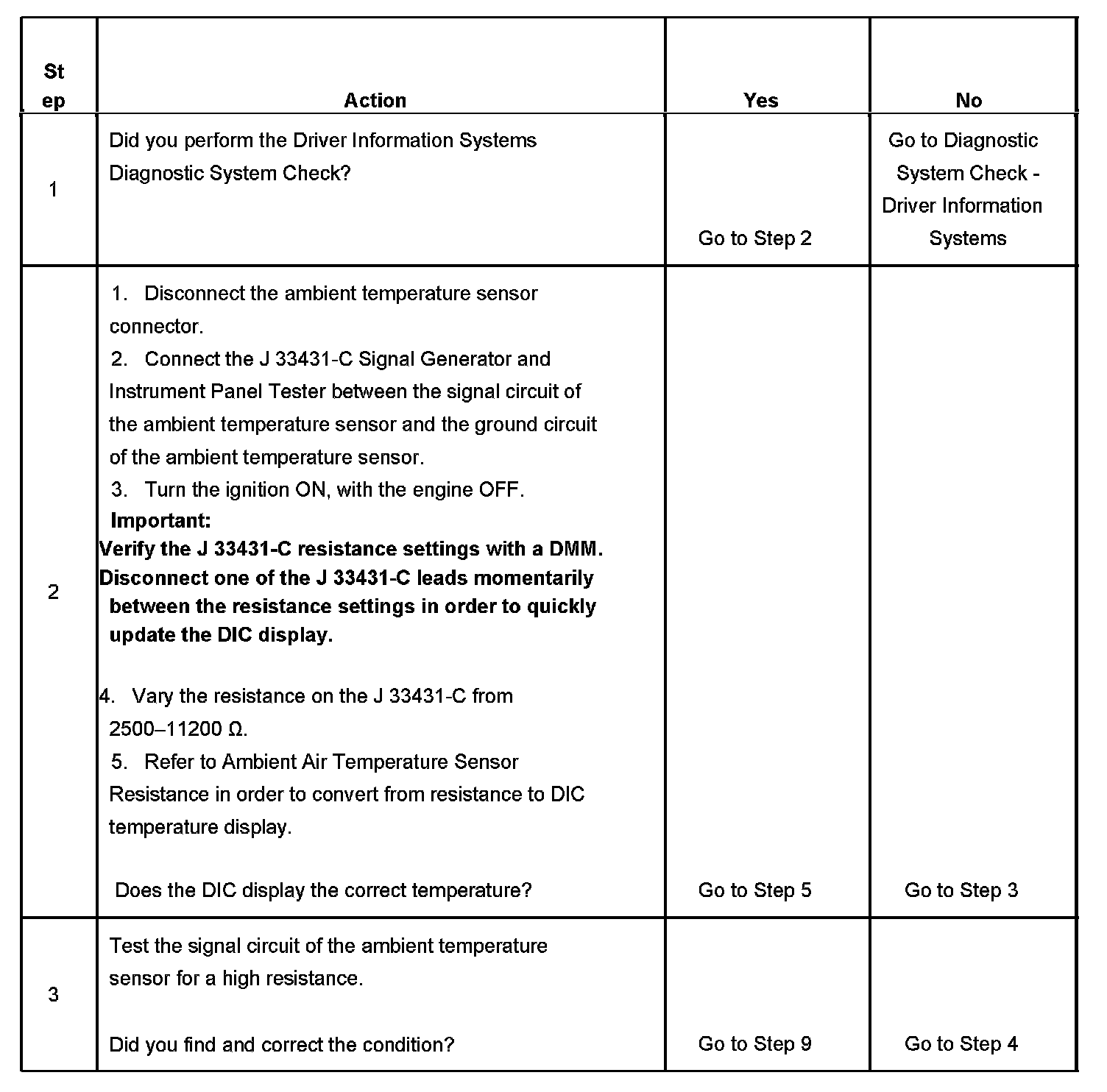 - Refer to Ambient Air Temperature Sensor Resistance in order to verify the correct ambient temperature sensor readings.