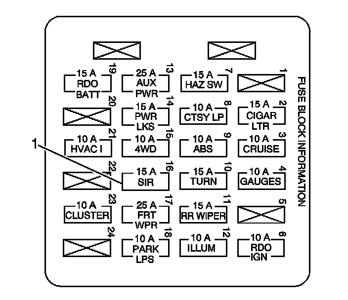 4. Install the SIR fuse to the I/P fuse block (1) located in the I/P fuse block.