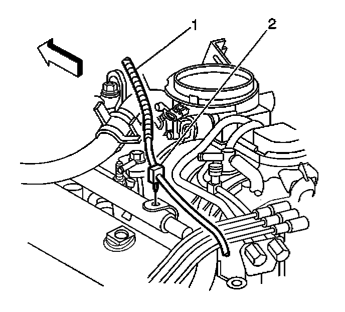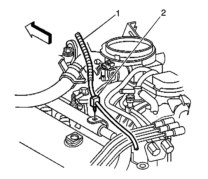 8. Remove the accelerator cable panel insulator retainer (2) from the accelerator cable (1).