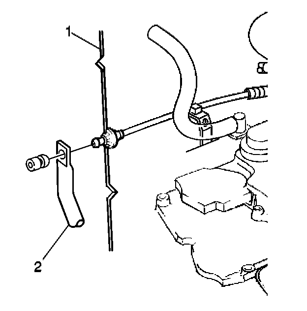 2. Install the accelerator cable panel insulator retainer (2) on the accelerator cable (1).