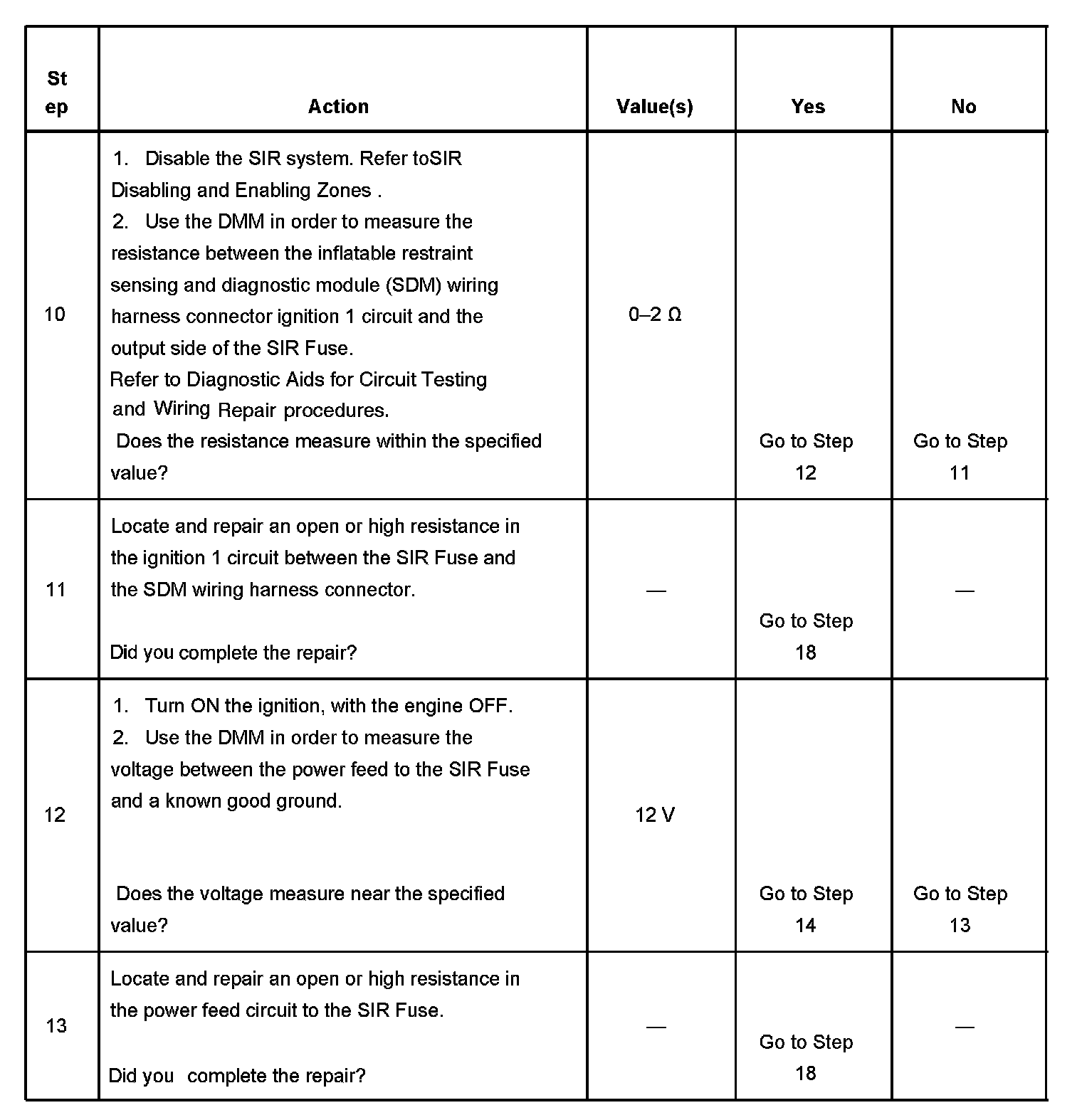 12. Tests for an open or high resistance in the ignition 1 voltage circuit to the SIR Fuse.