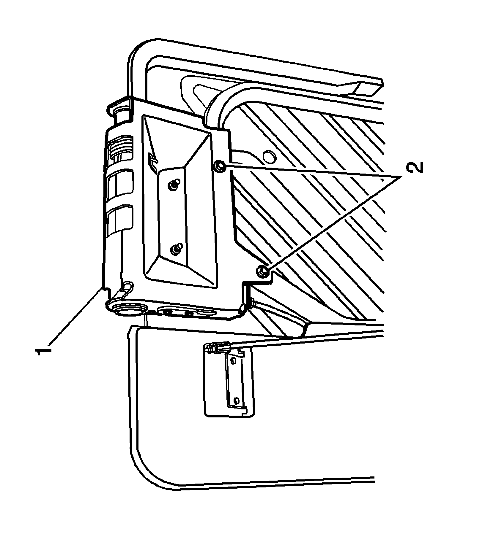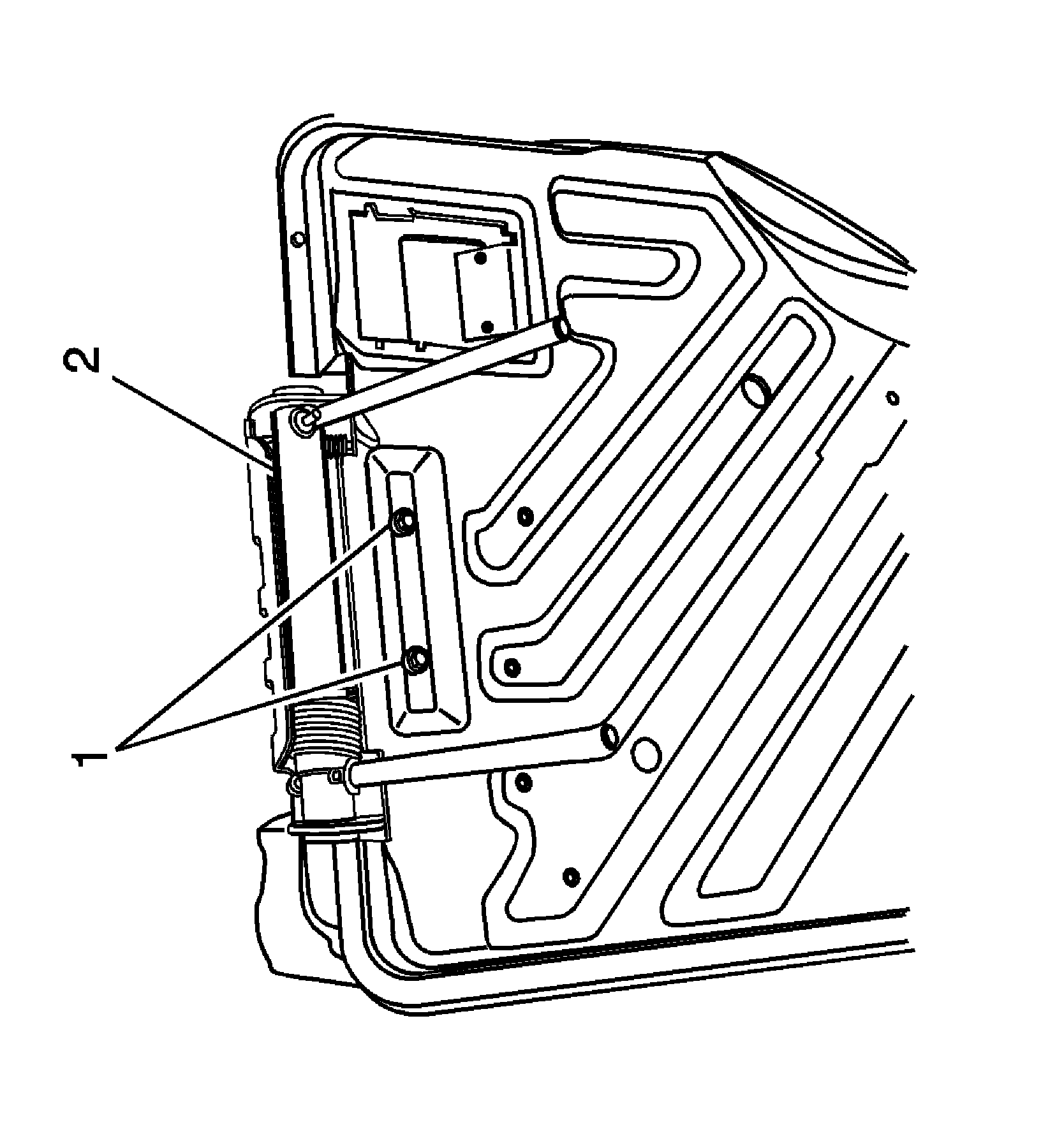 4. Install the 2 bolts (2) that retain the rear head restraint retractor assembly (1) to the seat back frame.