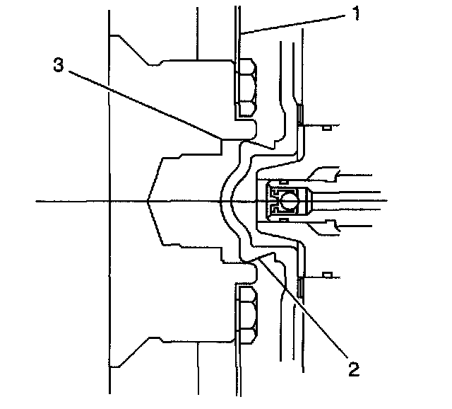 3. Align the torque converter hub (2) in the engine crankshaft (3) and install the torque converter to flywheel bolts.