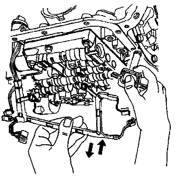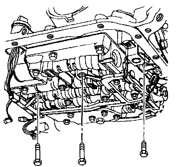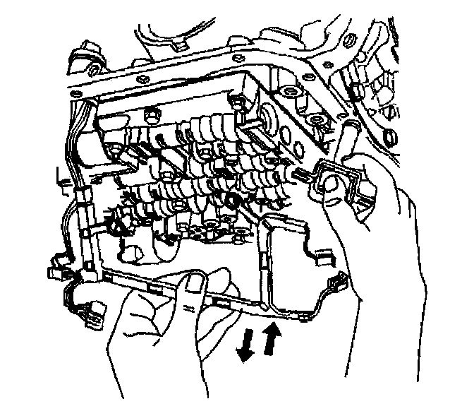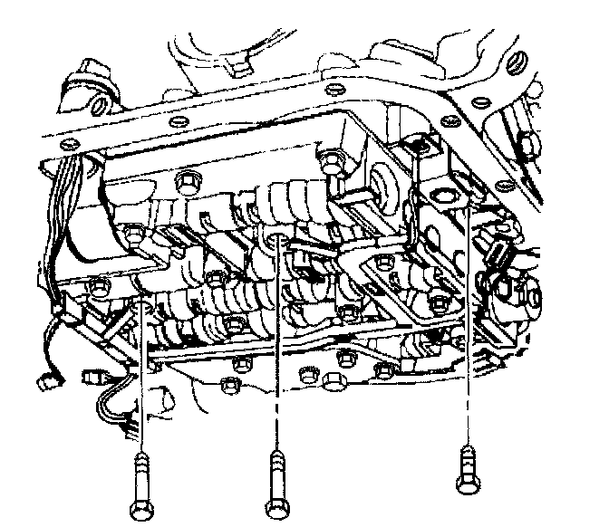 10. Remove the TCC solenoid retaining bolts and the valve body bolts which retain the internal wiring harness.