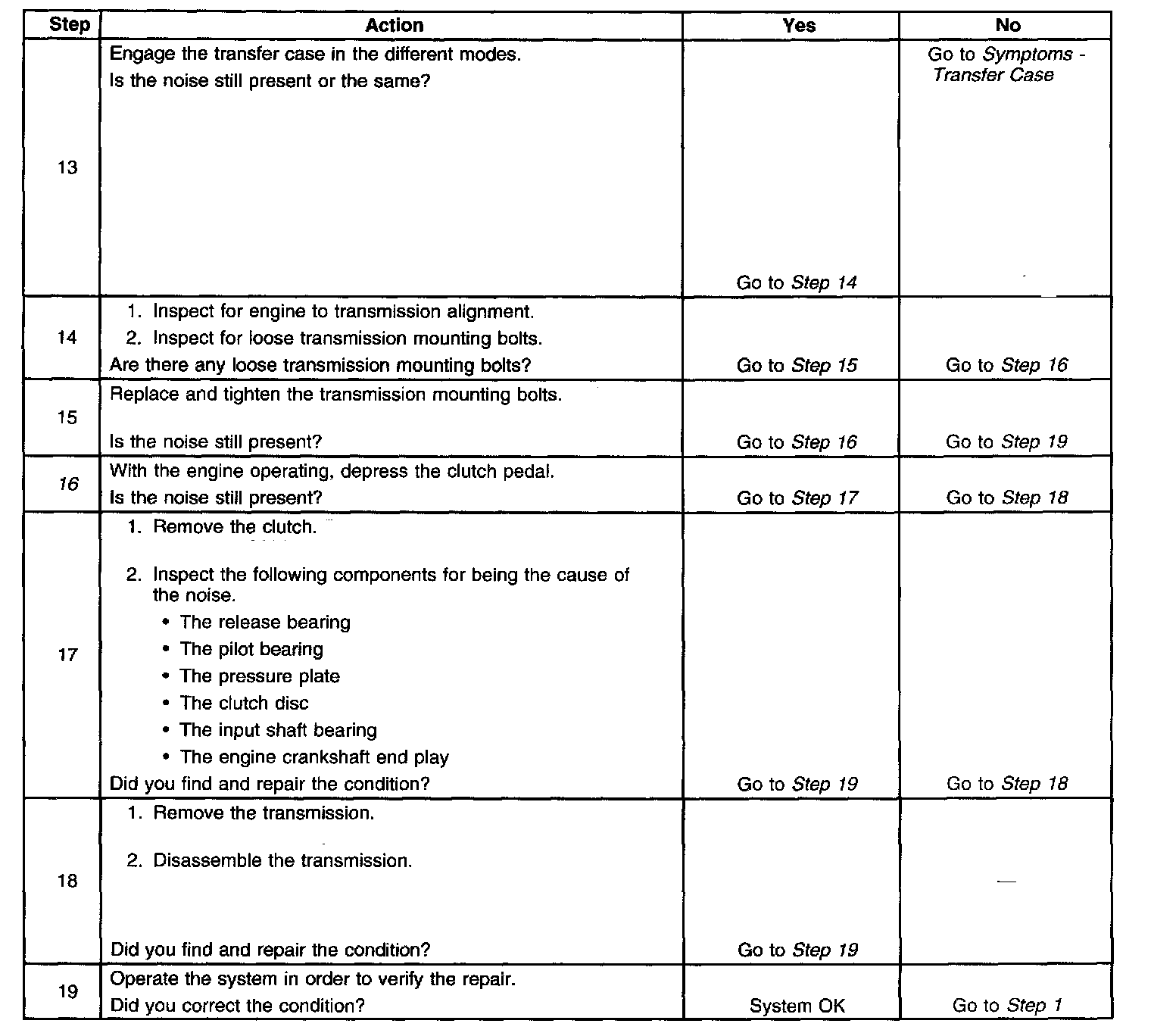 16. This step tests to determine if clutch components are making the noise. Depress the clutch pedal slowly and listen for the change in noise. If the noise changes while pressing the pedal, it may be a faulty clutch component. If the noise does not change until the clutch is completely disengaged, the transmission component is faulty.