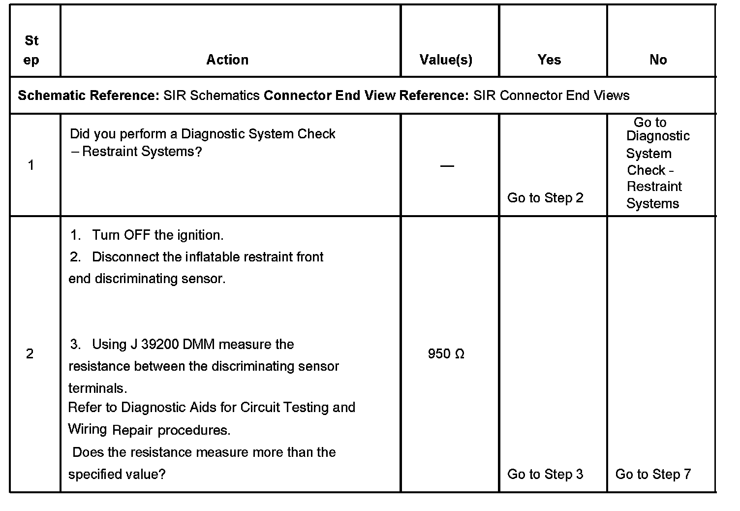 CIRCUIT DESCRIPTIONThe inflatable restraint sensing and diagnostic module (SDM) monitors the front end discriminating sensor circuit for front impact detection. The SDM processes the signal provided by the front end discriminating sensor to further support deployment of the air bags. The front end discriminating sensor is an input only to the SDM and does not directly cause air bag deployment. When you first turn the ignition switch to the RUN position, the inflatable restraint sensing and diagnostic module (SDM) performs tests to diagnose critical malfunctions within itself. The SDM then performs the following continuous diagnostic tests on the deployment loops: