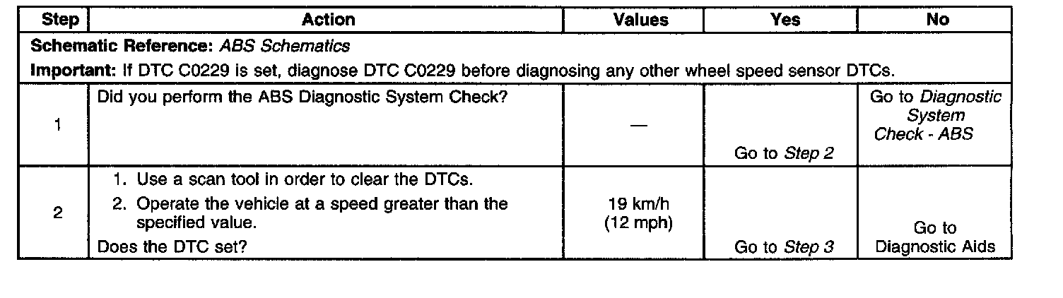 The corresponding wheel speed sensor signal is less than 6 km/h (4 mph) for 5 seconds, or 120 seconds in order to set both DTC'S.