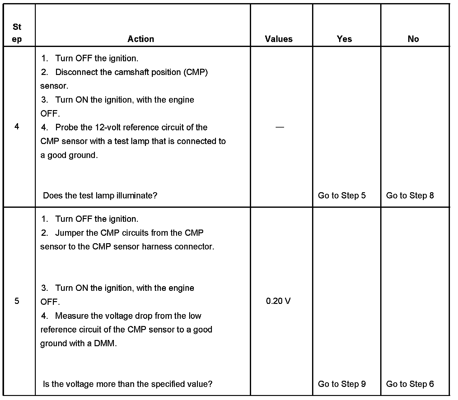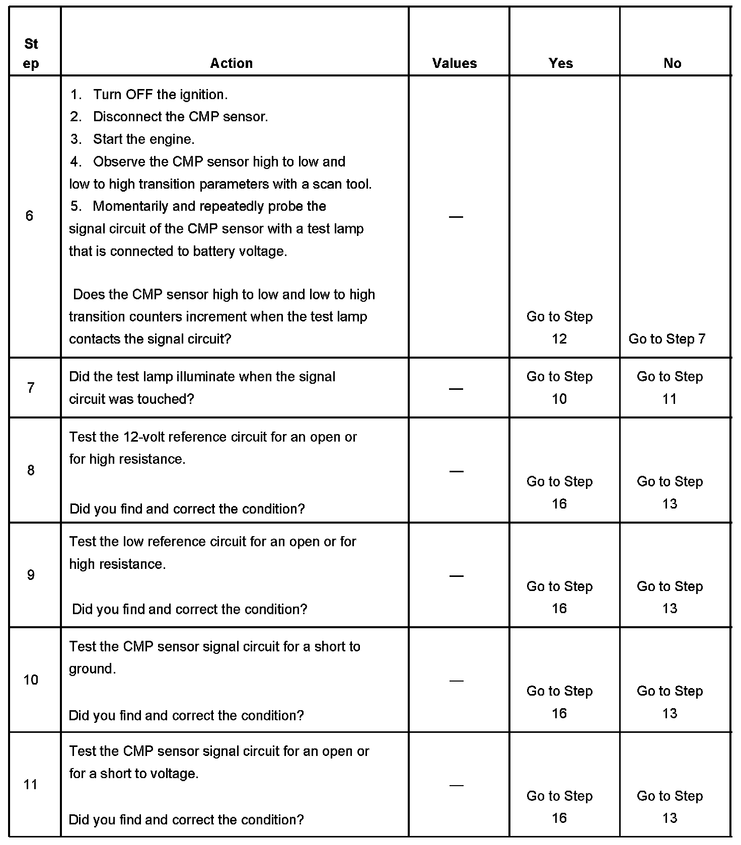 6. This step tests the CMP sensor signal circuit. Applying a voltage causes the CMP sensor high to low and low to high parameter to increase if the circuit and the PCM are operating properly.
