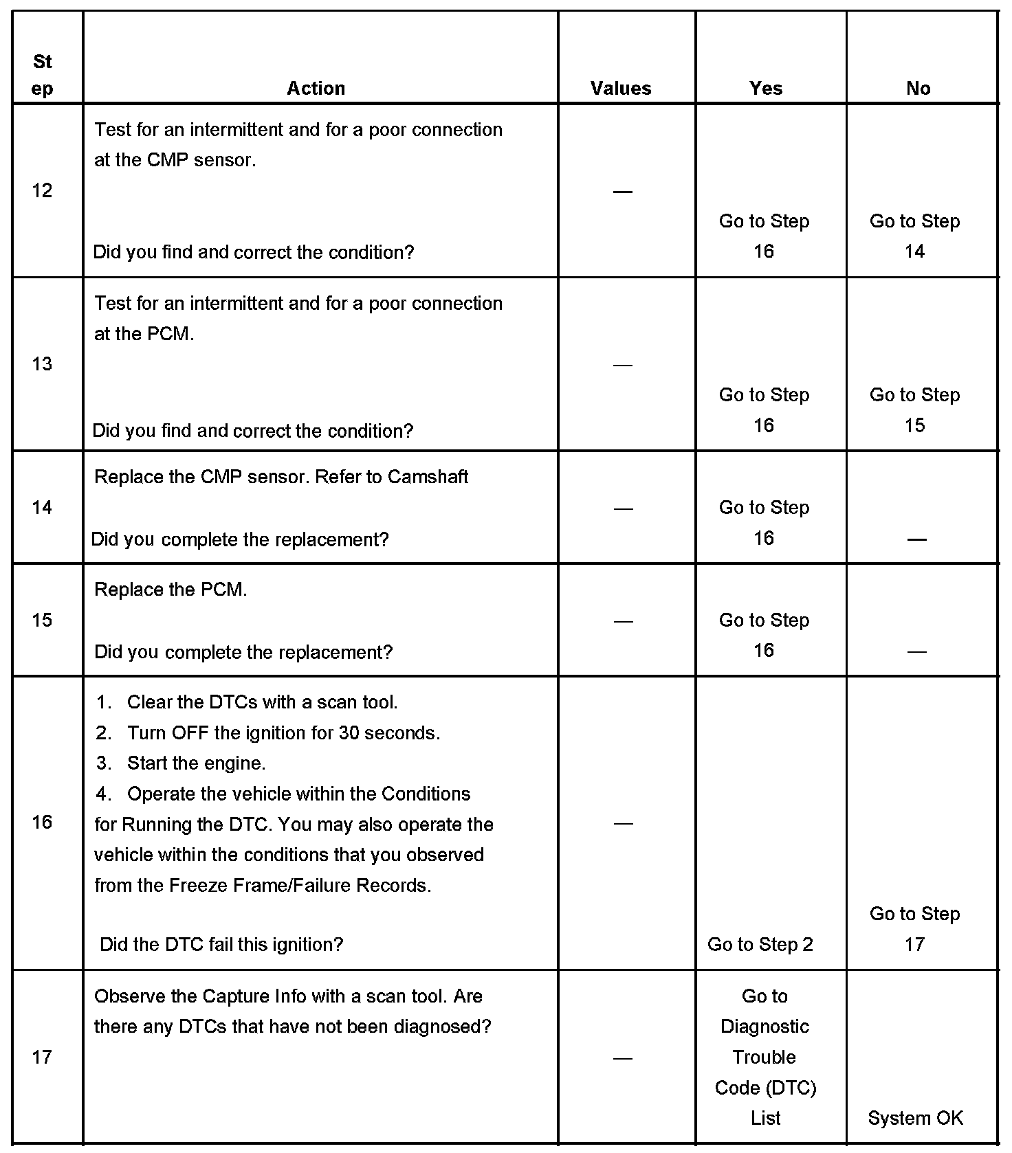 The CMP sensor reference pulse is not detected once every 2 crankshaft revolutions.