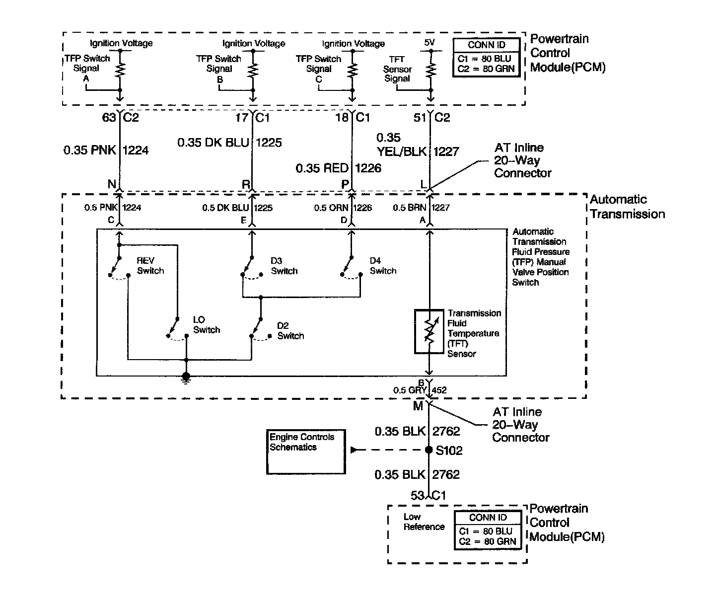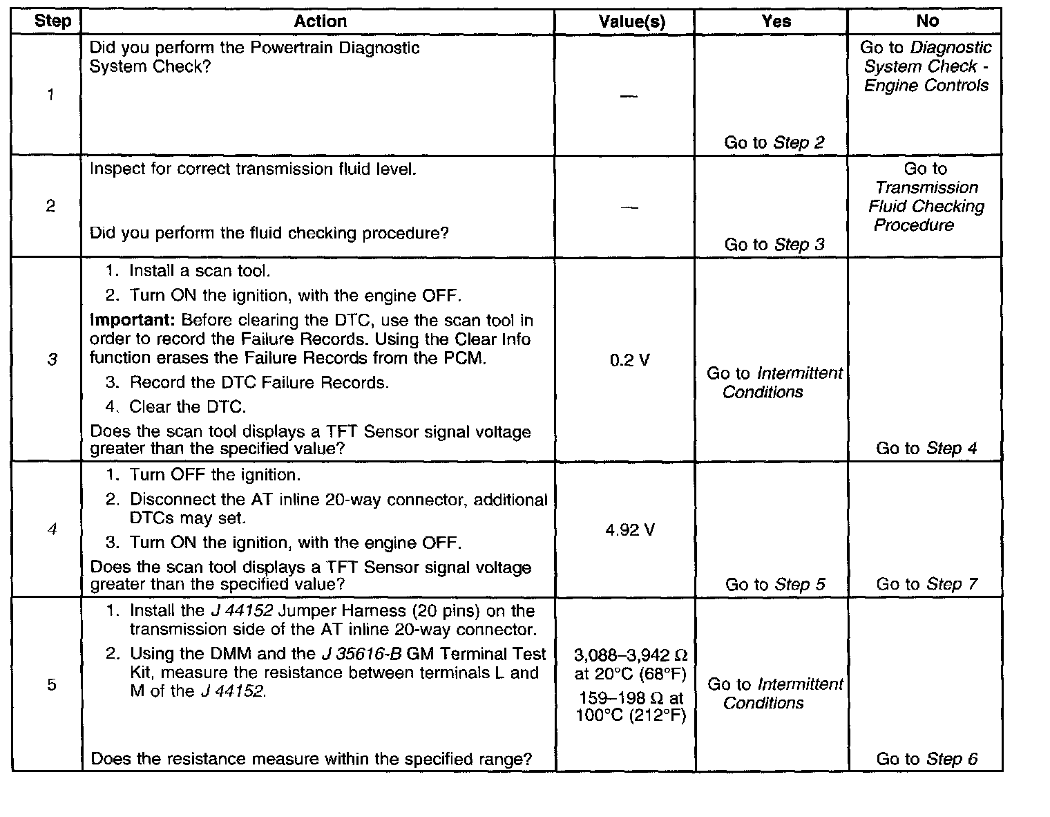 The automatic Transmission Fluid Temperature (TFT) sensor is part of the automatic Transmission Fluid Pressure (TFP) manual valve position switch. The TFT sensor is a resistor, or thermistor, which changes value based on temperature. The sensor has a negative-temperature coefficient. This means that as the temperature increases, the resistance decreases, and as the temperature decreases, the resistance increases. The Powertrain Control Module (PCM) supplies a 5-volt reference signal to the sensor on the TFT sensor signal circuit and measures the voltage drop in the circuit. When the transmission fluid is cold, the sensor resistance is high and the PCM detects high signal voltage. As the fluid temperature warms to a normal operating temperature, the resistance becomes less and the signal voltage decreases. The PCM uses this information to control shift quality and torque converter clutch apply.