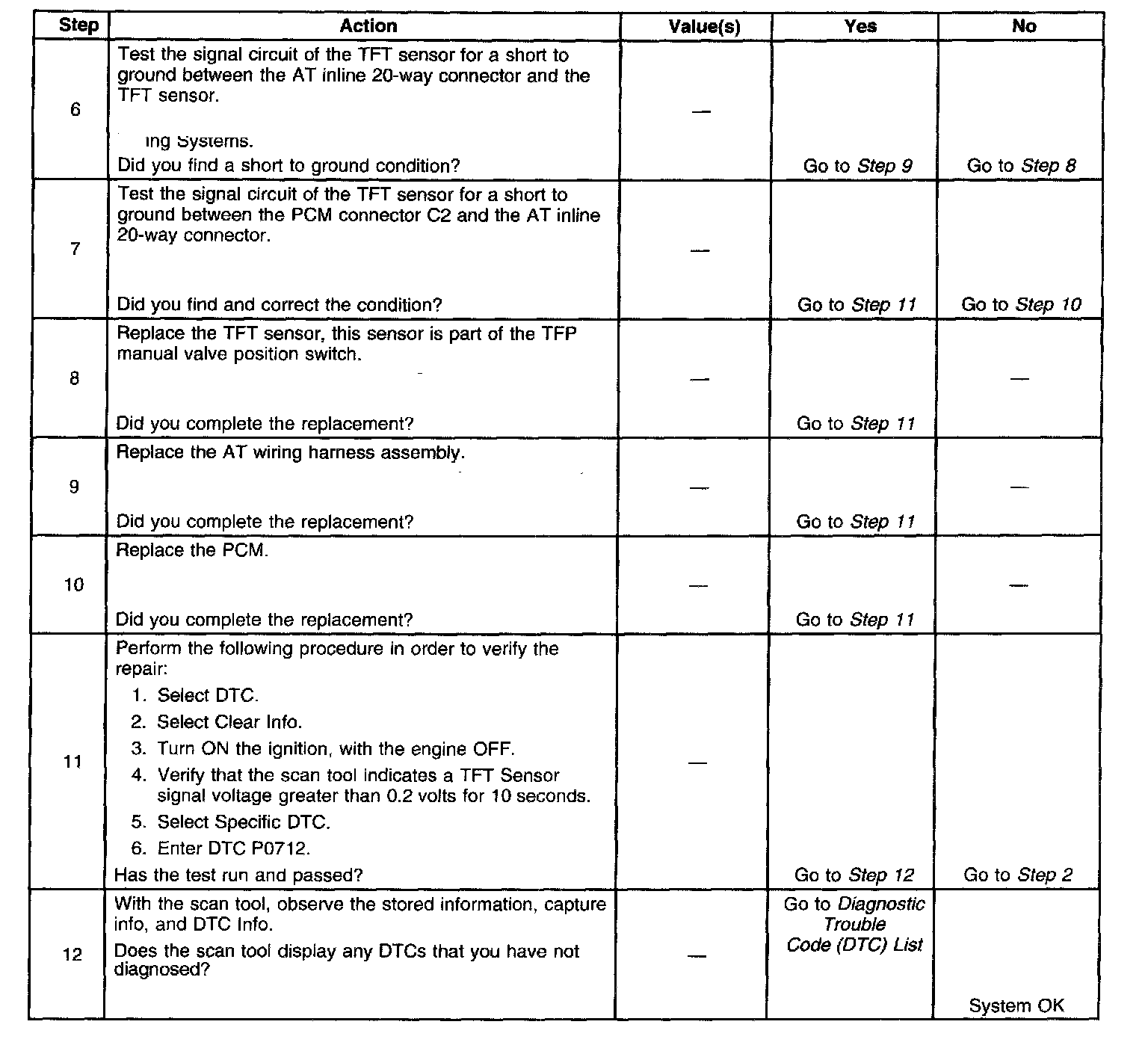 When the PCM detects a continuous short to ground in the TFT signal circuit or in the TFT sensor, then DTC P0712 sets. DTC P0712 is a type C DTC.