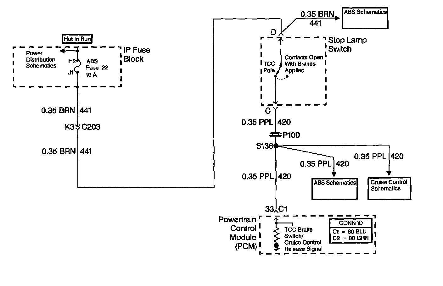 The brake switch indicates brake pedal status to the Powertrain Control Module (PCM). The brake switch is a normally-closed switch that supplies battery voltage on the TCC brake switch signal circuit to the PCM. Applying the brake pedal opens the switch, interrupting voltage to the PCM. When the brake pedal is released, the PCM receives a constant voltage signal. If the PCM receives a zero voltage signal at the brake switch input, and the Torque Converter Clutch (TCC) is engaged, the PCM de-energizes the TCC solenoid valve. The PCM disregards the brake switch input for TCC scheduling if there is a brake switch circuit fault.